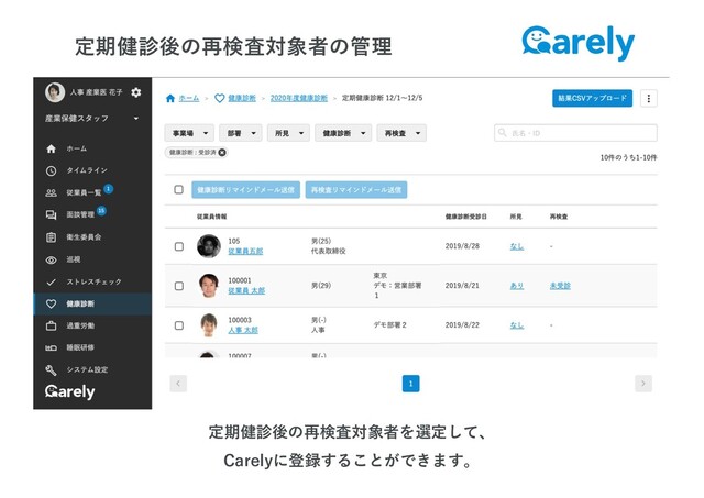 定期健診後の再検査対象者の管理 定期健診後の再検査対象者を選定して、 Carelyに登録することができます。