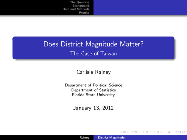 Might Turnout be Higher Under PR? • Disproportional systems leave some voters without representation (Powell 2000, Karp and Banducci 2008). • Proportional rules gives parties incentive to disperse across the ideological space, making narrow appeals to voters (Cox 1990). • Proportional rules create “nationally competitive districts” in which parties have an incentive to mobilize everywhere (Powell 1982, Cox 1999, Selb 2009). In summary, under PR, citizens should be more likely to... 1 feel represented (H2), 2 feel close to a party (H3), 3 be contacted (H4), ...and then vote (H1). Rainey District Magnitude