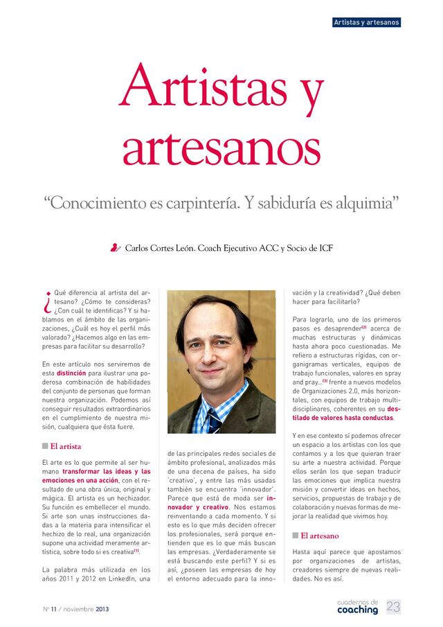 ahora el concepto de artesano, más cercano a la pa- labra de origen griego demiurgo ( ). Alguien que, como ya decía Platón, copia las ideas para llevarlas a la realidad, igual que el artesano fabrica una mesa viendo el dibujo de la mesa. En este sen- tido, el dios cristiano es un artista creador del mundo y el dios plató- nico, el demiurgo, es un artesano, construyendo con cosas que ya es- tán en el mundo. ¿Hacen falta artesanos en nuestras organizaciones? Defi nitivamente, sí. La empresa también tiene como fun- ción estructurar ideas y llevarlas a cabo. Hace falta también magia para ejecutar con precisión y detalle un trabajo. Como decía el alquimista, médico y astrólogo Paracelso, la ma- gia detesta a los vagos. No todos tene- mos la habilidad de terminar lo que se ha empezado, no todos estamos siempre en modo creativo, y es ésta una capacidad determinante para los que quieren mejorar nuestro entorno. El don de la ejecución. Correcta, pre- cisa, bien hecha. Los resultados y la efi cacia, la utilidad y la practicidad. La revolución de los hacedores (4). Por eso también importa que las or- ganizaciones dispongan de procesos, planes, estrategias, que midan sus re- sultados, evalúen y aprendan de ello. Y es que no todo tiene que ser innovar y trabajar ‘out of the box’. Seguimos en la realidad cotidiana y en cierto modo ‘ya está todo inventado’. Esto hace que también tenga mucho valor la puesta en escena, el vestuario, la logística, en defi nitiva, que la obra esté preparada para su representación diaria. Esto es lo que hacen los artesanos, entender que el público cada vez es diferente y que la misma obra será diferente y única en su repetición. Y la artesanía de cada día también es nuestra mi- sión como organizaciones. Evidentemente, todos tenemos nues- tra parte de artistas y otra de arte- sanos. Es la combinación de ambas perspectivas la que nos hace po- derosos y transformadores. Se- guramente tenderemos más a un aspecto, donde nos sentimos más cómodos y conseguimos mejores re- sultados. Lo que importa es que esa elección sea consciente, para noso- tros y para nuestra empresa, porque desarrollamos ese talento a través de las organizaciones en las que traba- jamos, en cuya misión creemos y cu- yos valores compartimos. Artistas y artesanos construimos el mundo… ¿cómo te declaras?