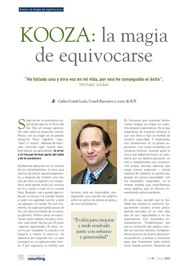 [email protected] No 10 / mayo 2013 “No fi jamos nuestros objetivos para ‘intentarlos’ sino para ‘conseguirlos’” Kooza: la magia de equivocarse (1) Lyn Heward & John U. Bacon. Cirque du Soleil. La Magia: una historia sobre el poder de la creatividad y la imagina- ción. Empresa Activa 2006. (2) Idem nota anterior. (3) Celebrate any progress. Don’t wait to get perfect. Ann McGee Cooper www.amca.com (4) Pedro Tomás Delgado. Emprendedor Social y Fundador y CEO de Aqua- phytex. Ver vídeo TEDxValladolid: To- palantismo. Hacia una sociedad de hacedores apasionados.