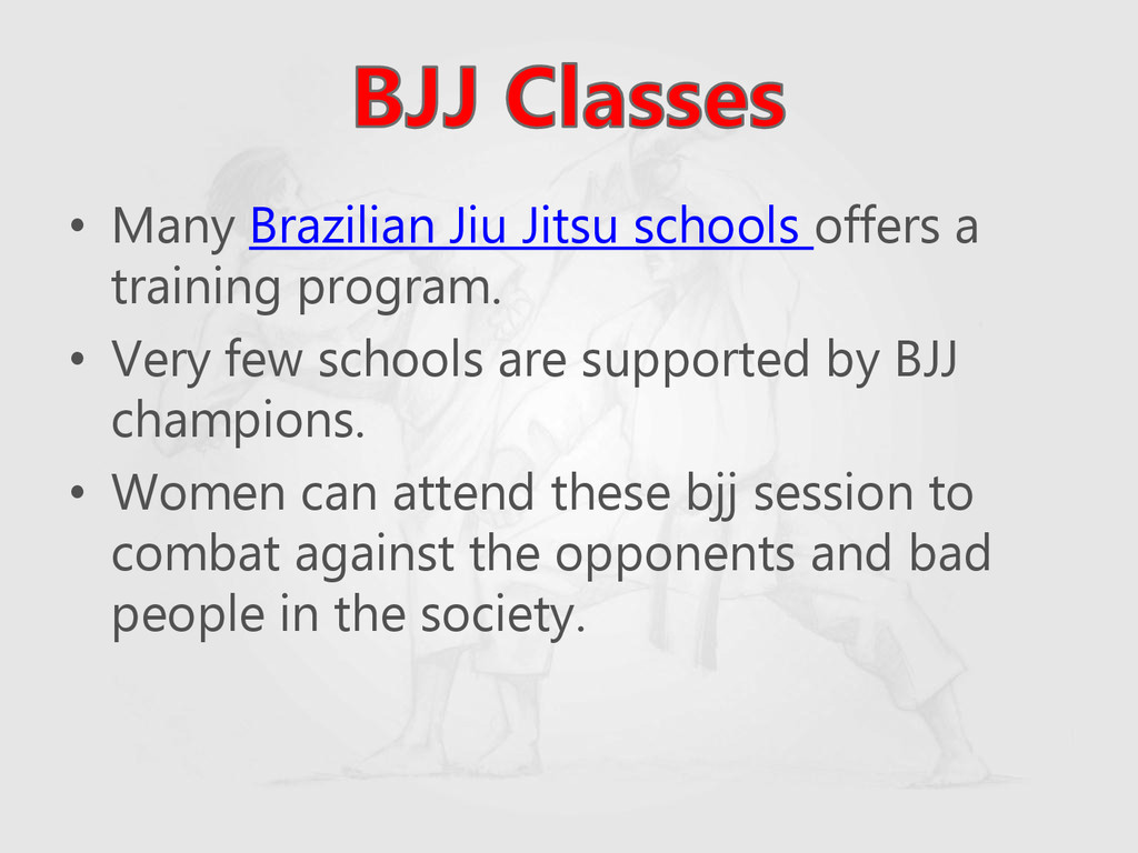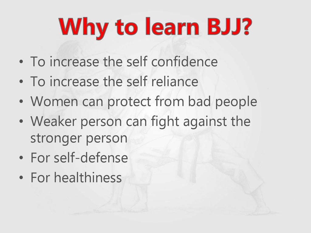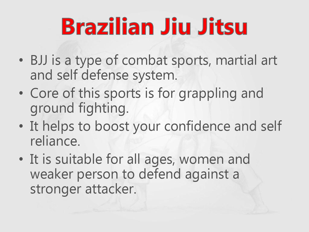 and self defense system. • Core of this sports is for grappling and ground fighting. • It helps to boost your confidence and self reliance. • It is suitable for all ages, women and weaker person to defend against a stronger attacker.