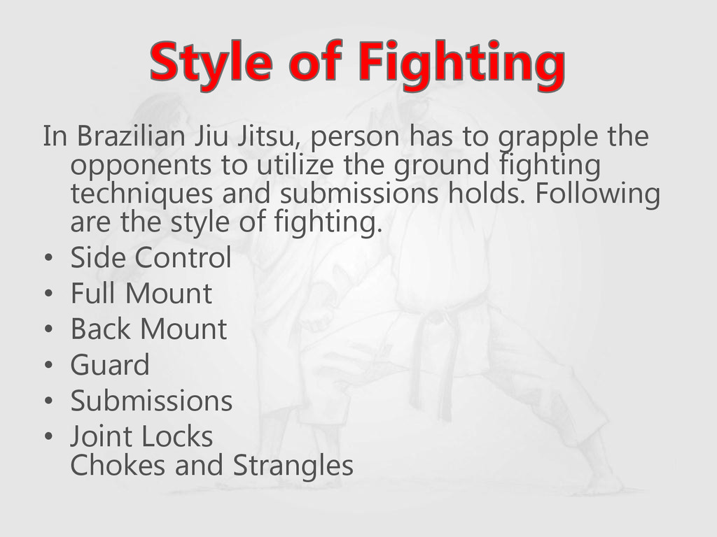 to utilize the ground fighting techniques and submissions holds. Following are the style of fighting. • Side Control • Full Mount • Back Mount • Guard • Submissions • Joint Locks Chokes and Strangles