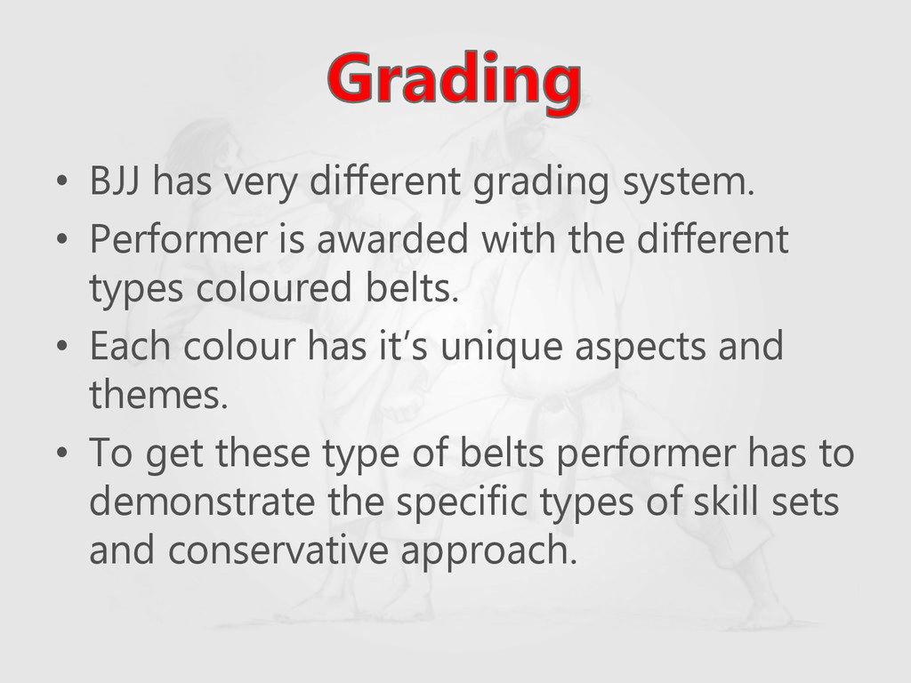 awarded with the different types coloured belts. • Each colour has it’s unique aspects and themes. • To get these type of belts performer has to demonstrate the specific types of skill sets and conservative approach.