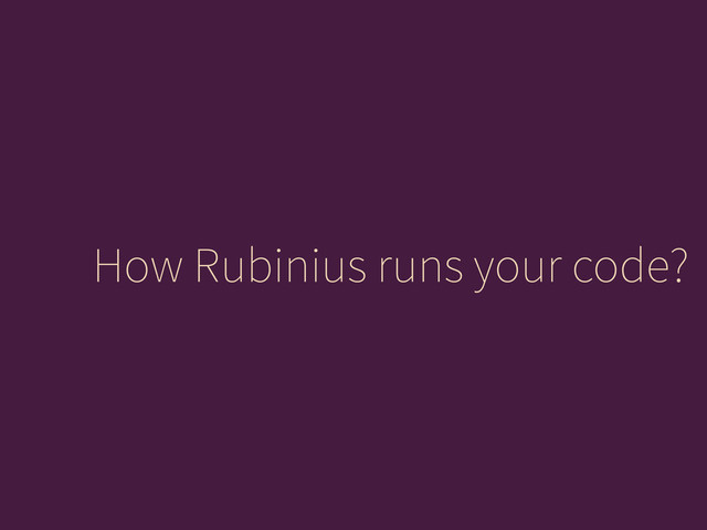 This talk presents the structure of Rubinius and how it works under the hood. It talks about its bootstrap process, the virtual machine, bytecode compiler, JIT, memory layout and garbage collection.