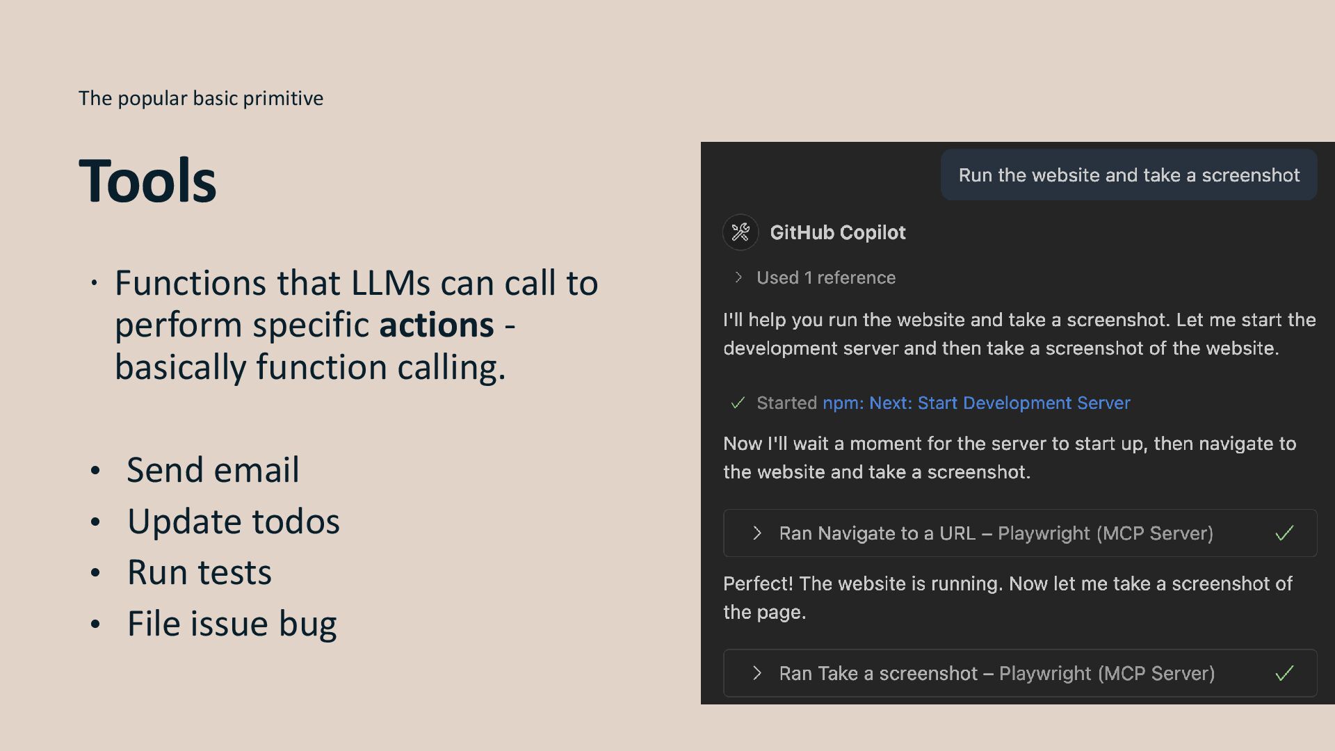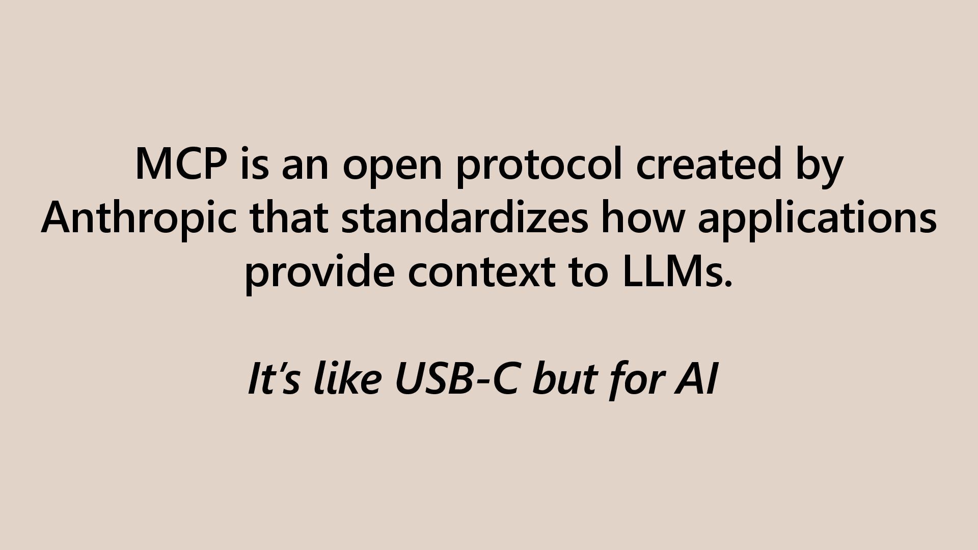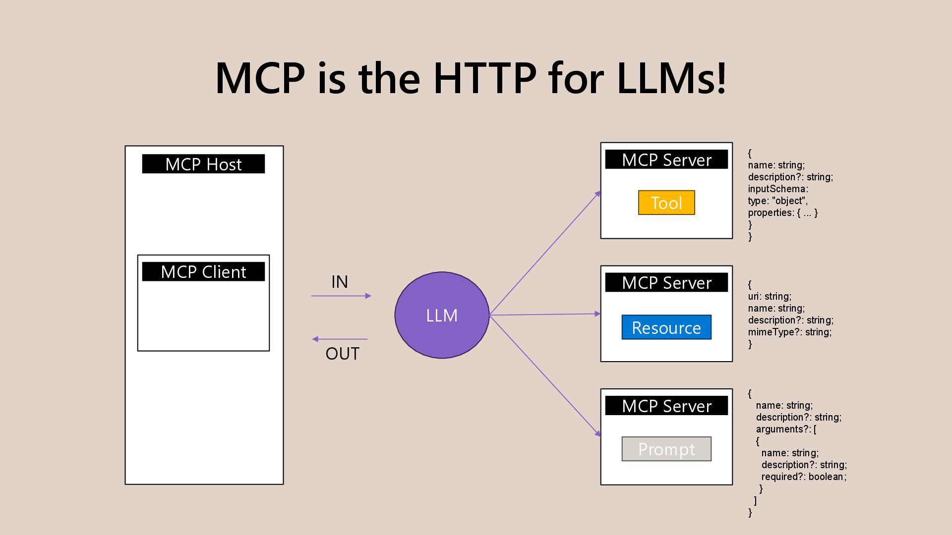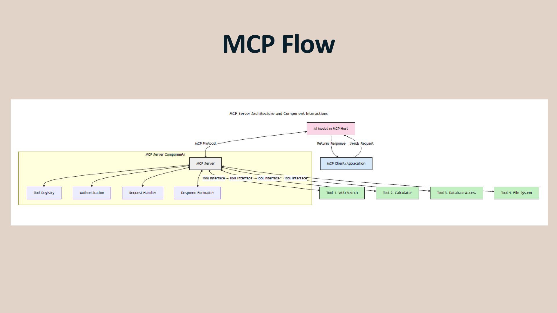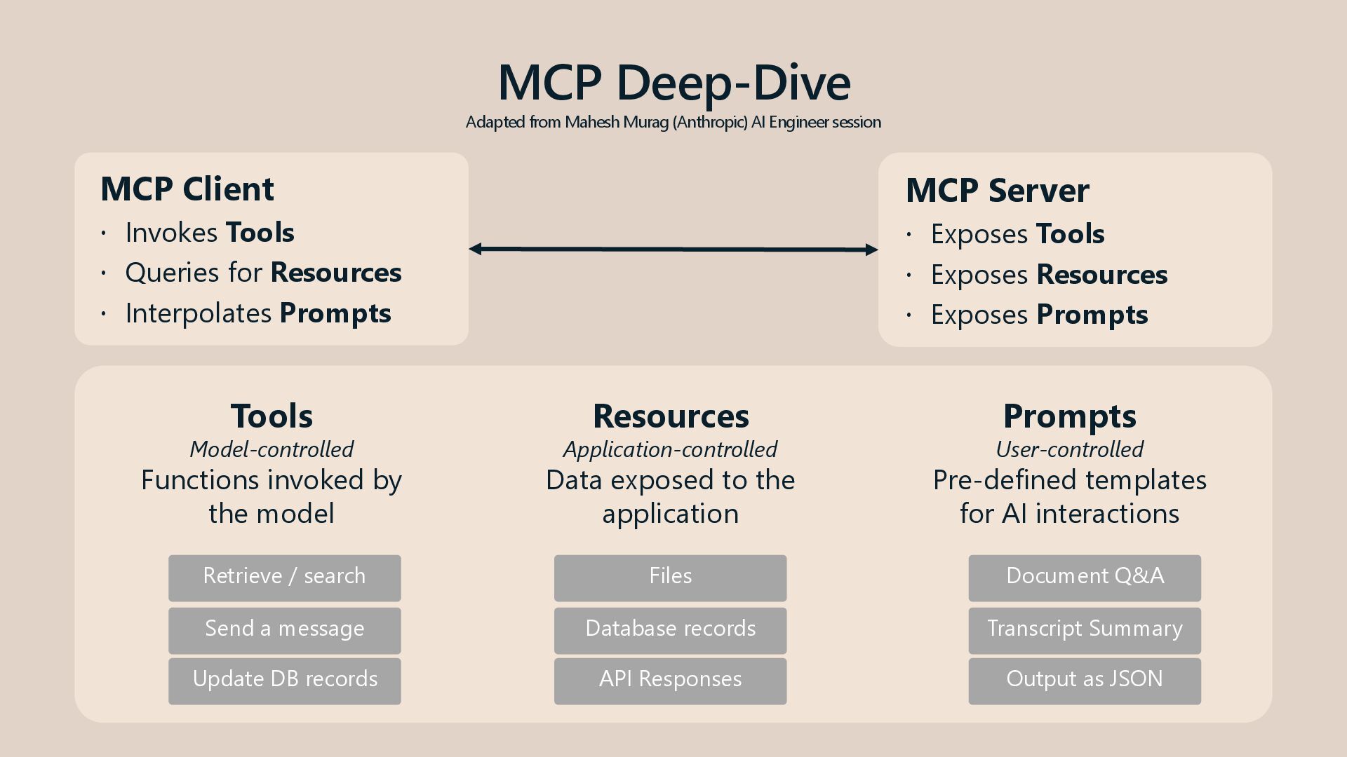 MCP Client Invokes Tools Queries for Resources Interpolates Prompts MCP Server Exposes Tools Exposes Resources Exposes Prompts Tools Model-controlled Functions invoked by the model Resources Application-controlled Data exposed to the application Prompts User-controlled Pre-defined templates for AI interactions Retrieve / search Send a message Update DB records Files Database records API Responses Document Q&A Transcript Summary Output as JSON