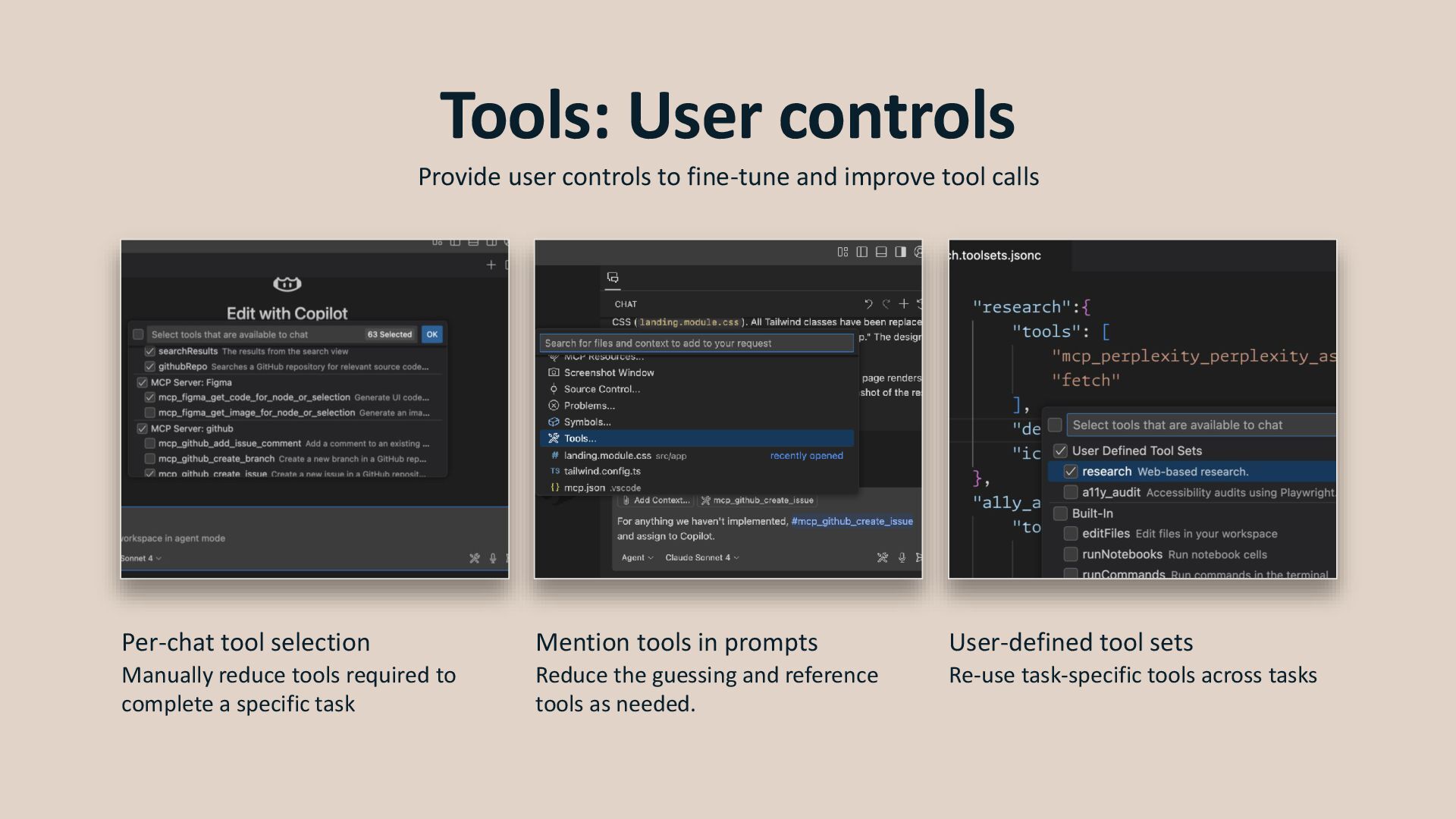 tool calls Per-chat tool selection Manually reduce tools required to complete a specific task Mention tools in prompts Reduce the guessing and reference tools as needed. User-defined tool sets Re-use task-specific tools across tasks