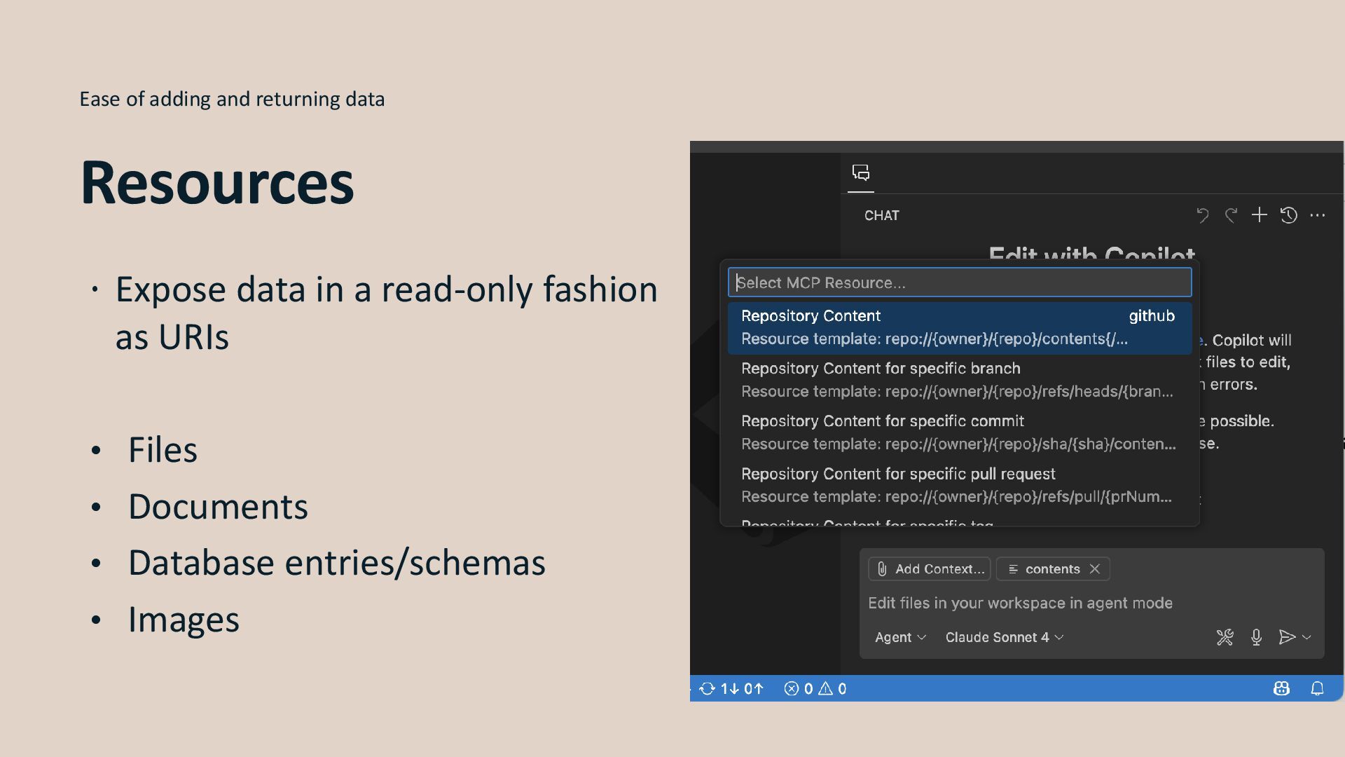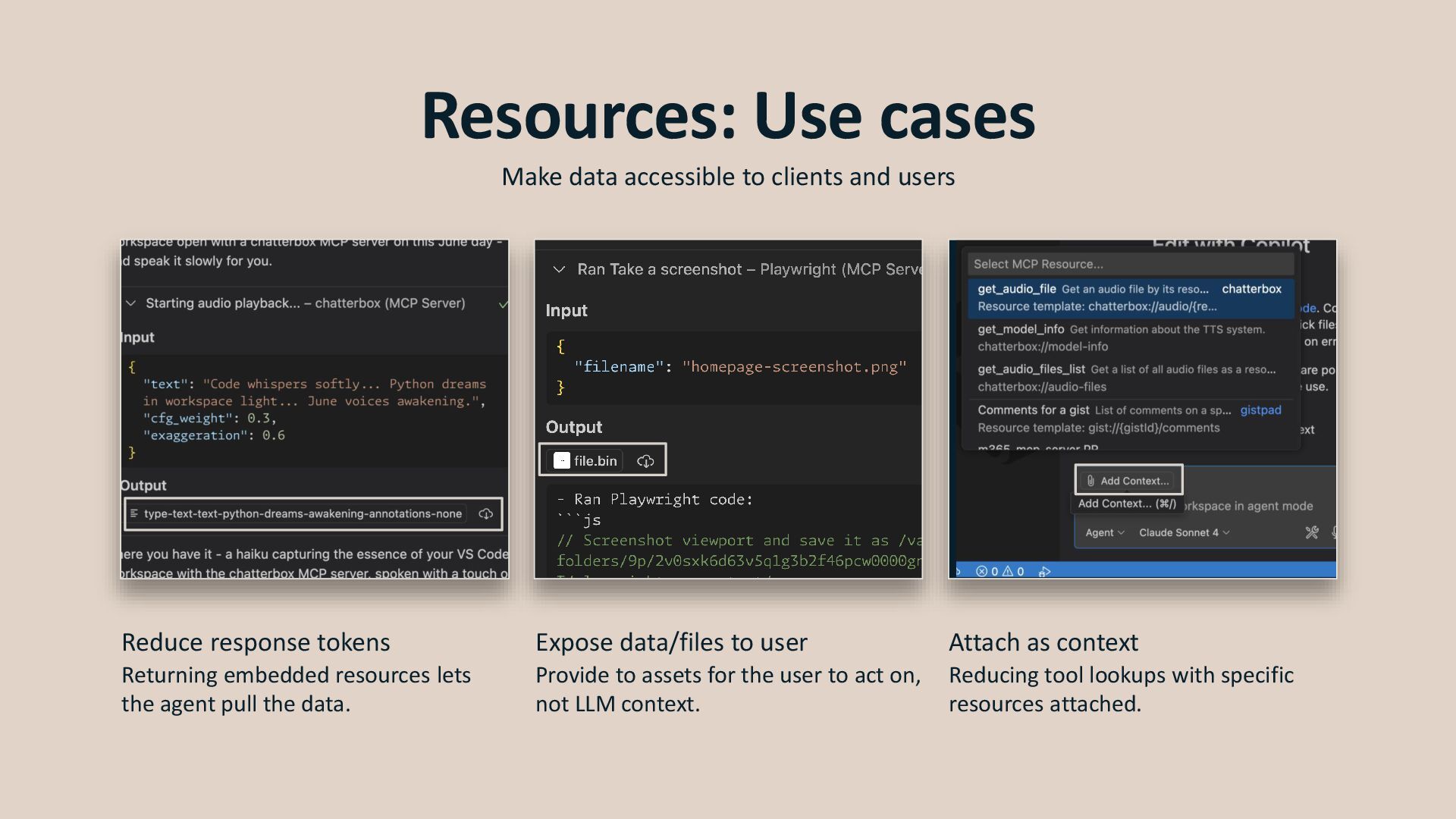 Reduce response tokens Returning embedded resources lets the agent pull the data. Expose data/files to user Provide to assets for the user to act on, not LLM context. Attach as context Reducing tool lookups with specific resources attached.