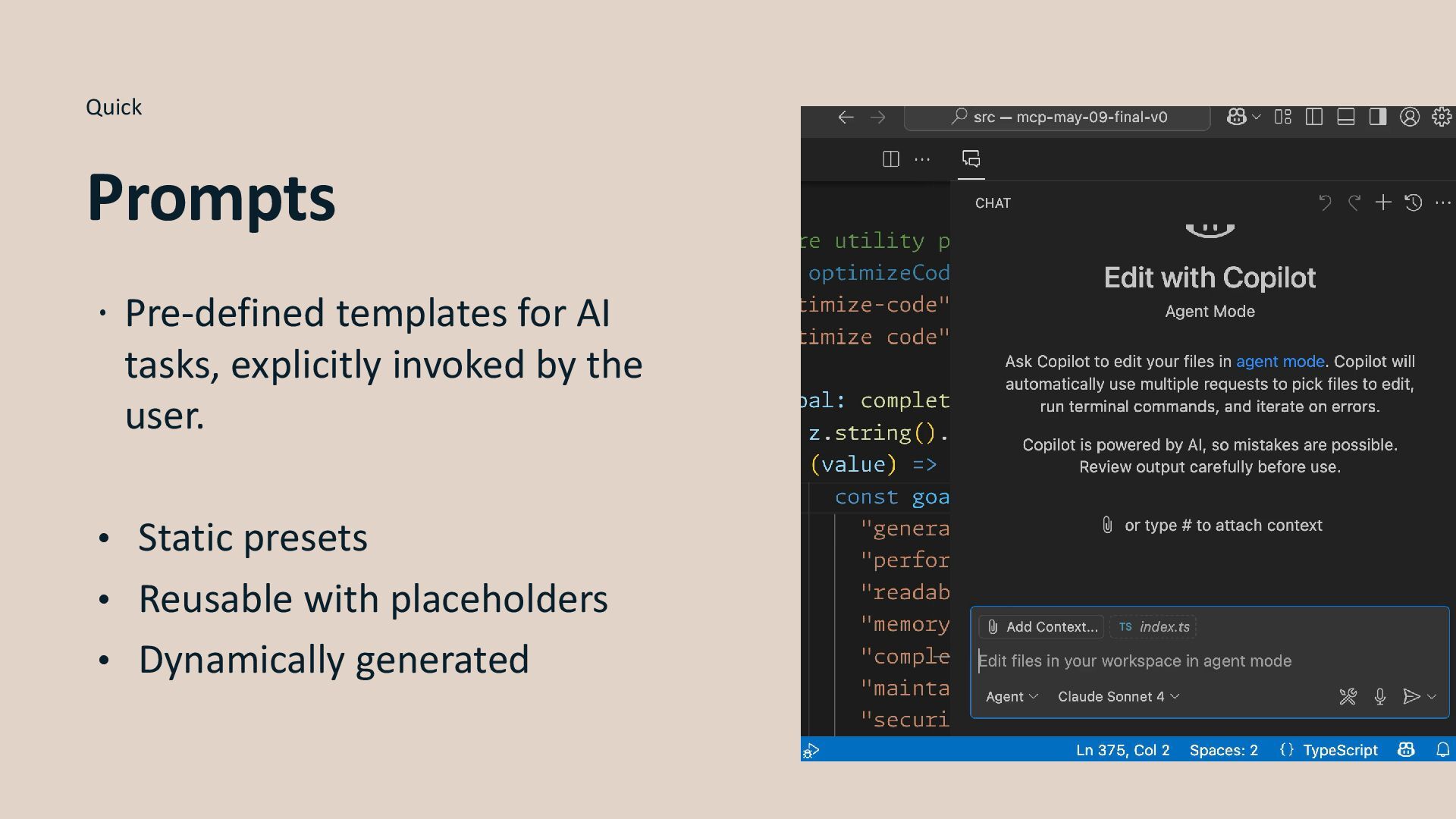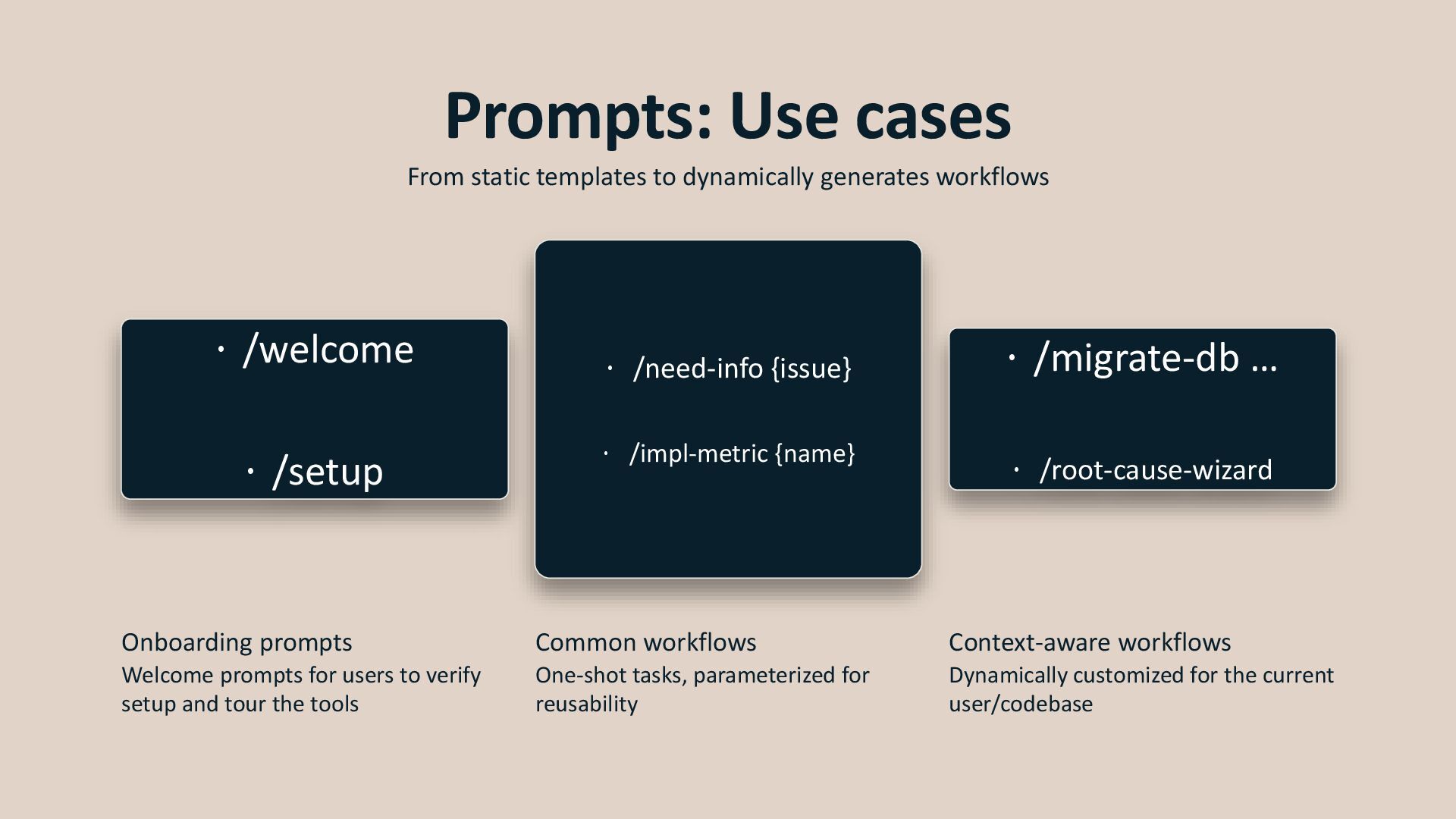 /migrate-db … /root-cause-wizard Prompts: Use cases From static templates to dynamically generates workflows Onboarding prompts Welcome prompts for users to verify setup and tour the tools Common workflows One-shot tasks, parameterized for reusability Context-aware workflows Dynamically customized for the current user/codebase