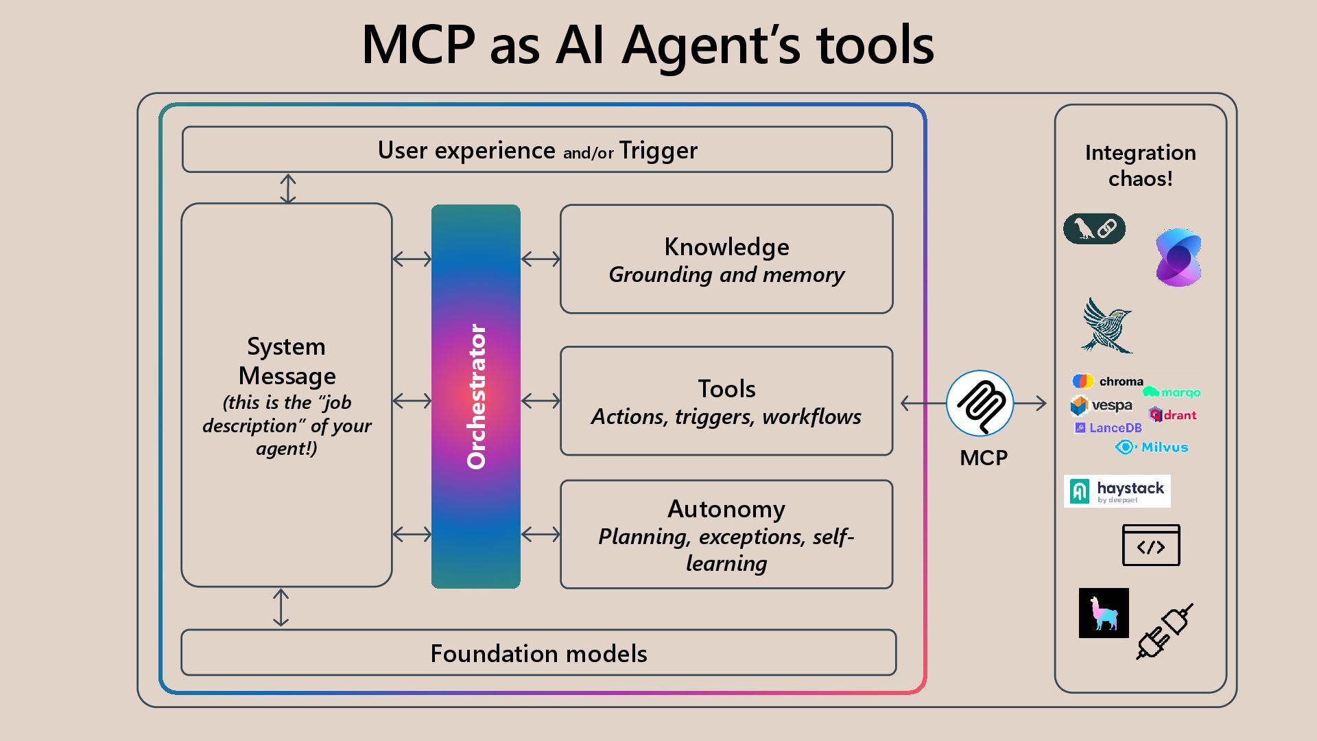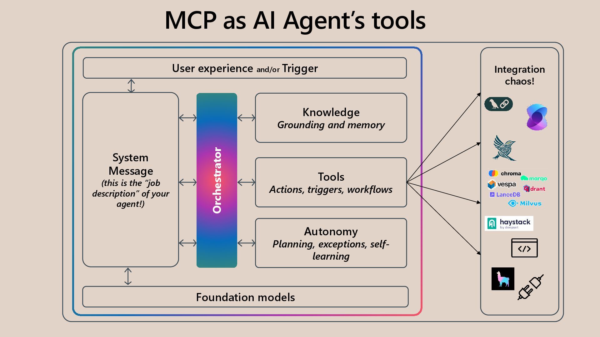 Actions, triggers, workflows Autonomy Planning, exceptions, self- learning Foundation models Integration chaos! System Message (this is the “job description” of your agent!) MCP as AI Agent’s tools MCP