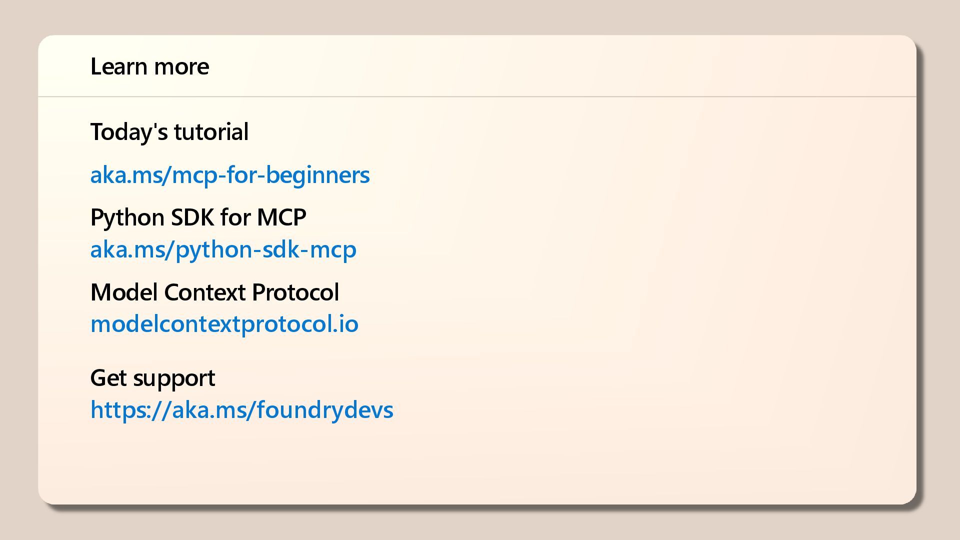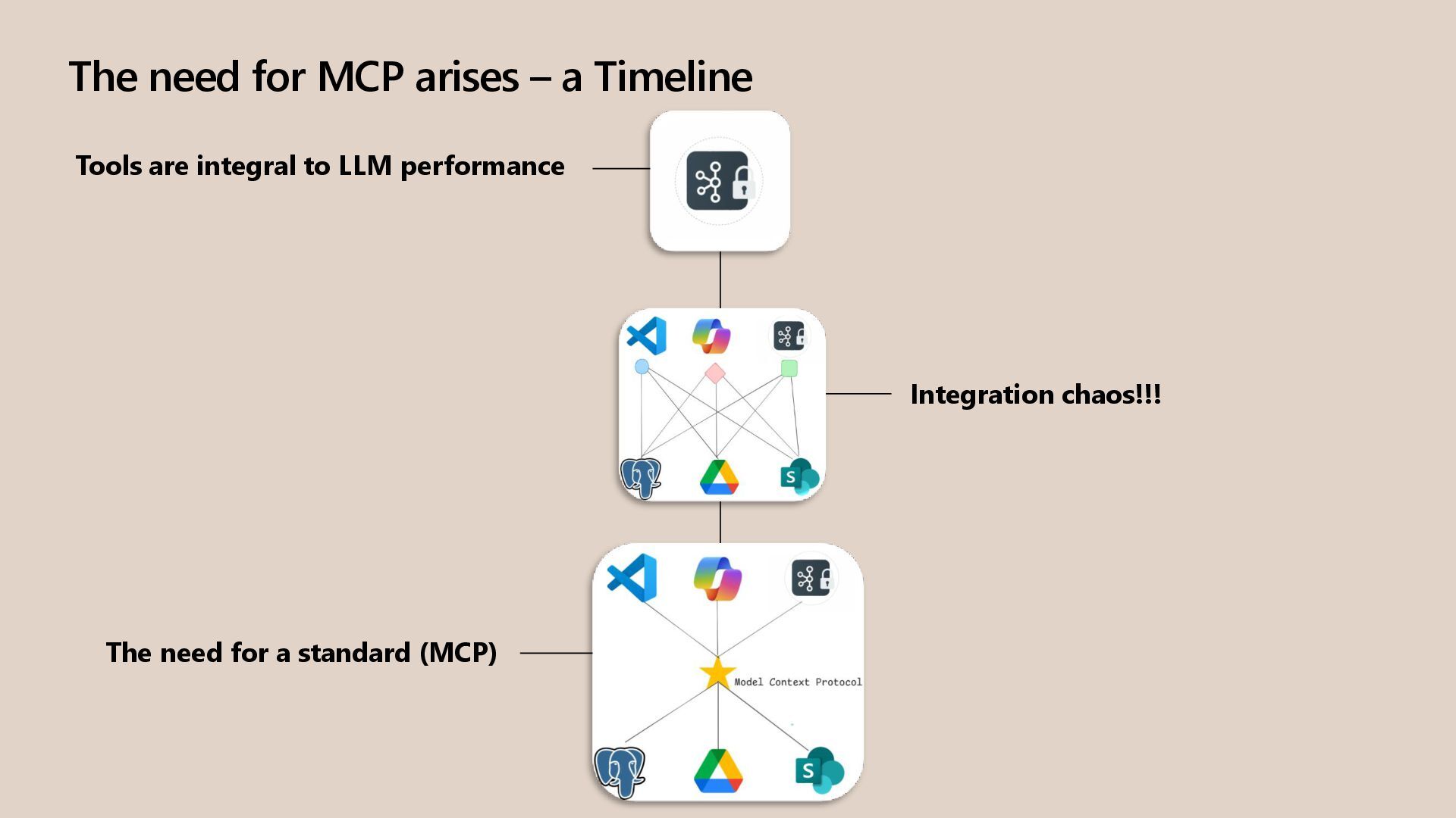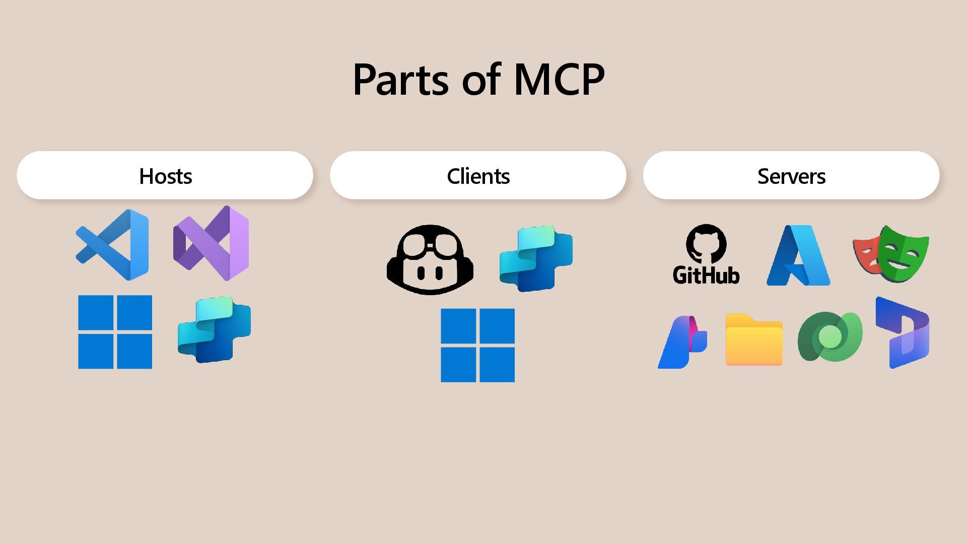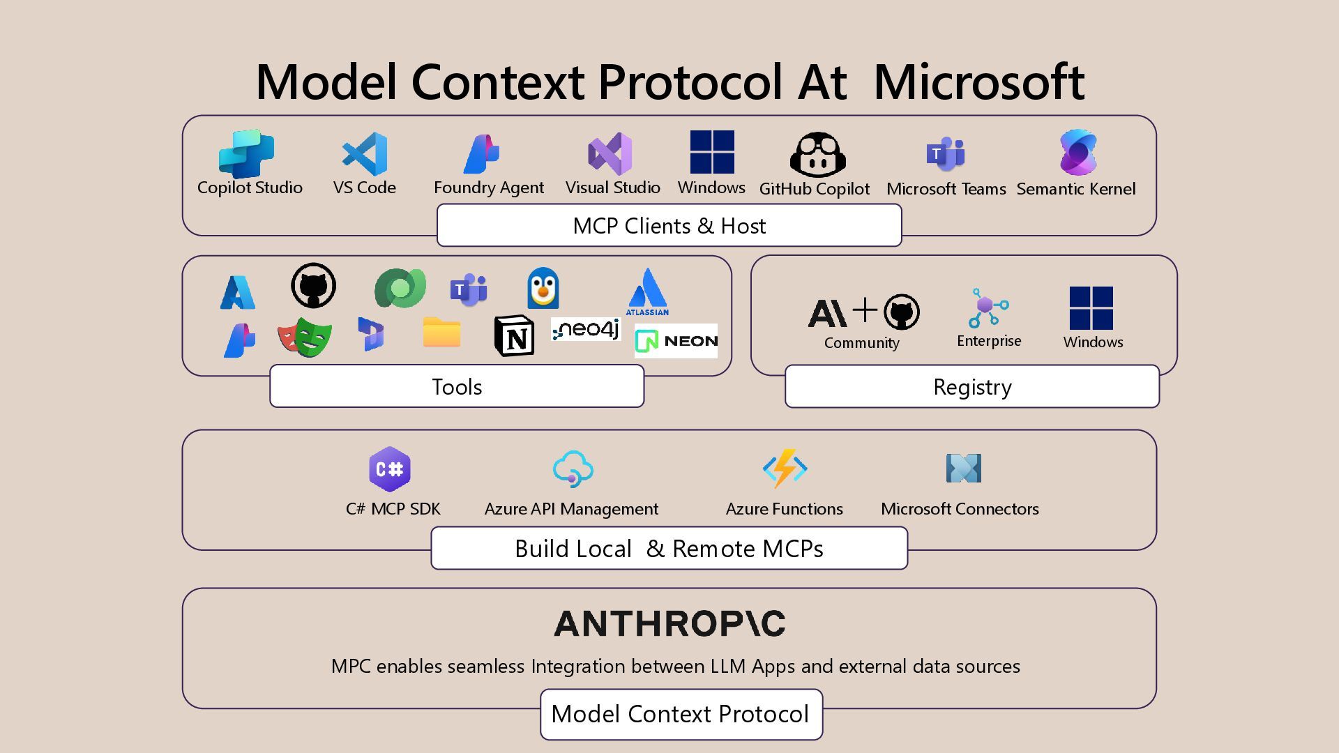 seamless Integration between LLM Apps and external data sources Azure API Management Build Local & Remote MCPs Tools Community Enterprise Windows MCP Clients & Host Copilot Studio VS Code Foundry Agent Visual Studio Semantic Kernel Registry GitHub Copilot C# MCP SDK Microsoft Connectors Azure Functions Microsoft Teams Windows