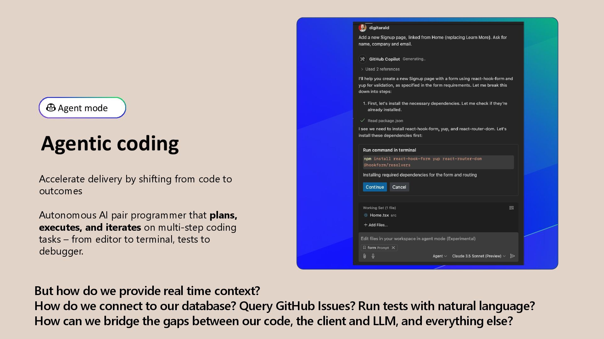 we connect to our database? Query GitHub Issues? Run tests with natural language? How can we bridge the gaps between our code, the client and LLM, and everything else? Agent mode Agentic coding Accelerate delivery by shifting from code to outcomes Autonomous AI pair programmer that plans, executes, and iterates on multi-step coding tasks – from editor to terminal, tests to debugger.