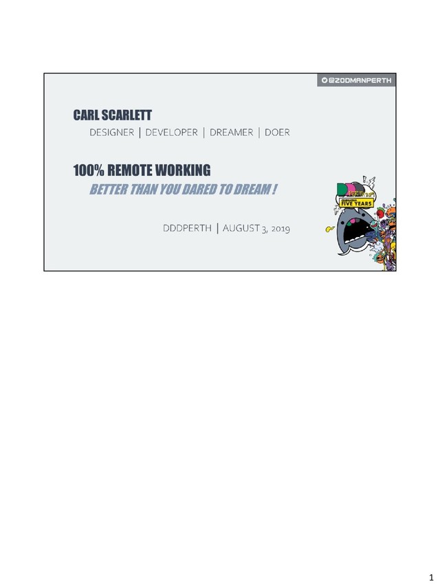 In this talk I'll share my experiences working 100% remotely for a company in a different time zone. I'll cover the techniques and the tech I use (both hardware and software), the challenges I face, and the peace I have found.