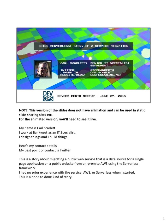 In this session I tell the story of how, with no prior experience, I took one of our company's existing public services and moved it from on-prem hosting and storage to completely cloud based using AWS and the Serverless framework. I'll walk through the iterative design-and-build process I used to evolve the system to the MVP state, and reflect on the pros and cons of decisions I made throughout the journey.