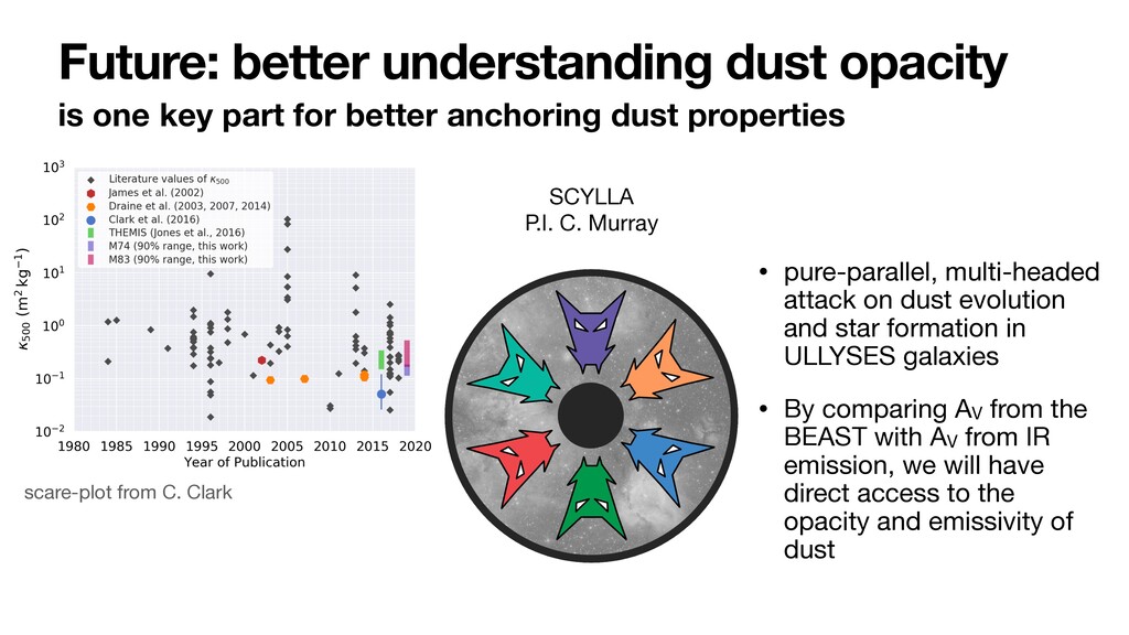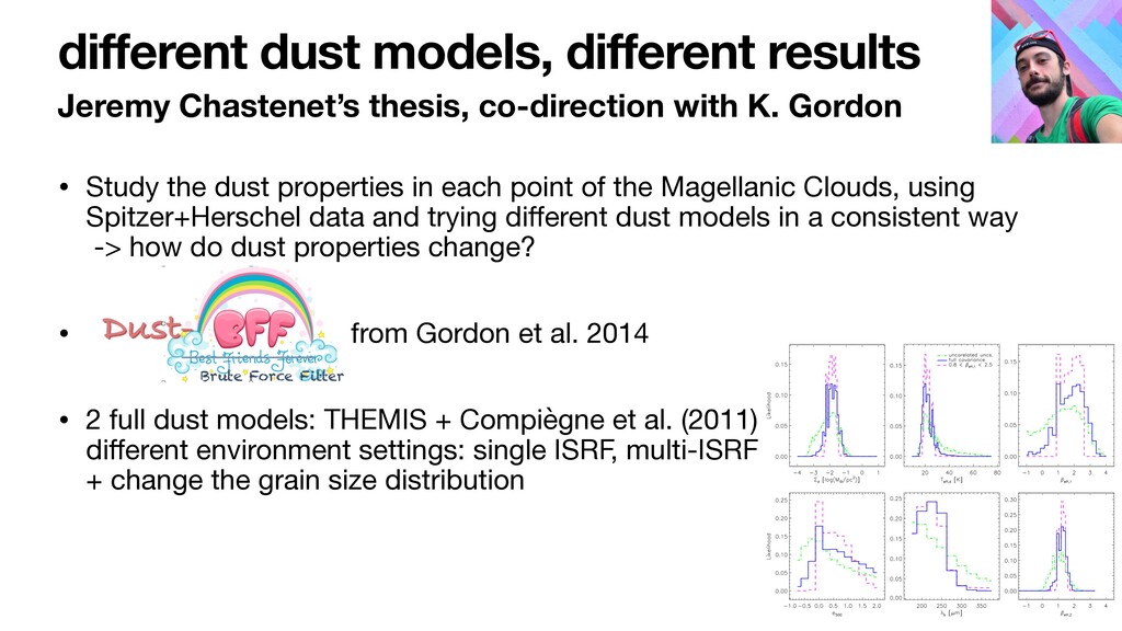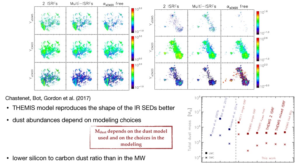 tracer of dust properties • Bot et al. 2004: ISO data: dust in the diffuse medium of the SMC • Gordon, Bot et al. 2009: Spitzer: dust abundance in Magellanic tail • Gordon, Roman-Duval, Bot et al. 2014: the Magellanic Clouds SEDs with Spitzer+Herschel are better fit at long wavelengths with a broken-emissivity modified black body • Roman-Duval, Gordon, Meixner, Bot et al. 2014: variations of the gas-to-dust variations in the Magellanic Clouds • Roman-Duval, Bot, Chastenet, Gordon 2017: stacked SEDs of IRAS+Planck in gas density bins -> the gas/dust decreases between the diffuse and the dense ISM of the Magellanic Clouds IR SED Mdust dust model Mgas gas to dust ratio metallicity does it scale? - dust growth - dust destruction + other dust prop. Mgas/Mdust=1200+1600-420 Roman-Duval et al. 2014, SMC