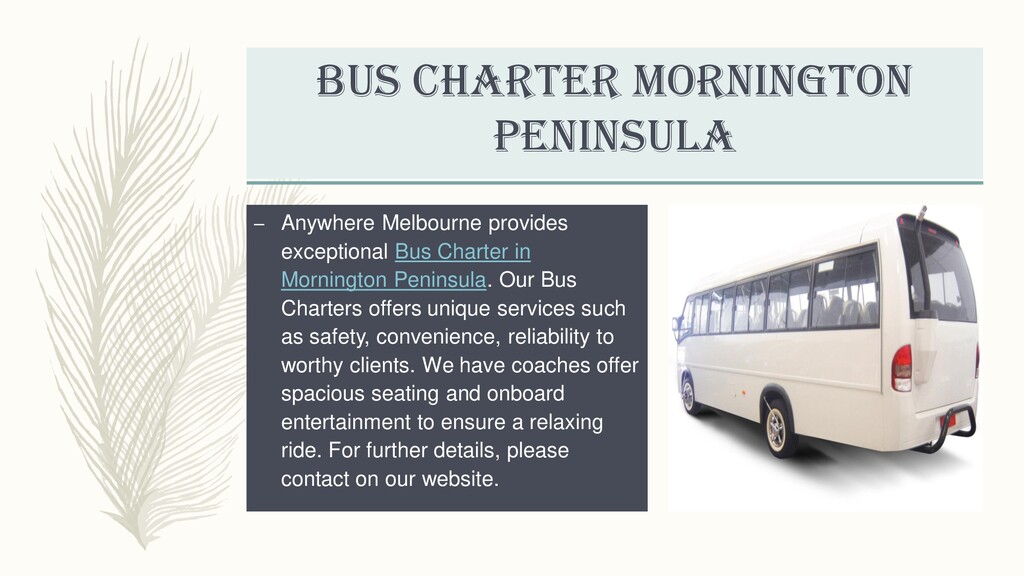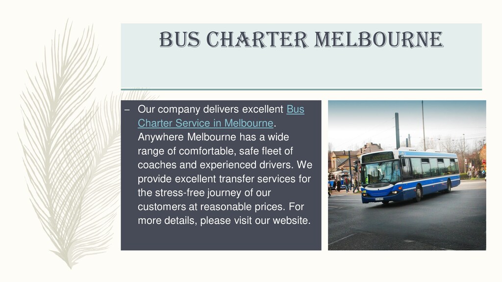 Our company delivers excellent Bus Charter( https://anywheremelbourne.com.au/bus-hire-melbourne )Service in Melbourne. Anywhere Melbourne has a wide range of comfortable, safe fleet of coaches and experienced drivers. We provide excellent transfer services for the stress-free journey of our customers at reasonable prices. For more details, please visit our website.