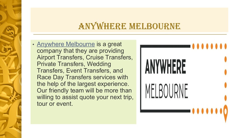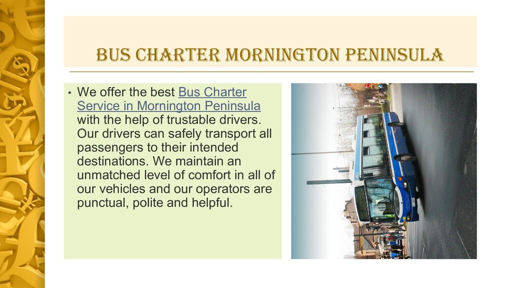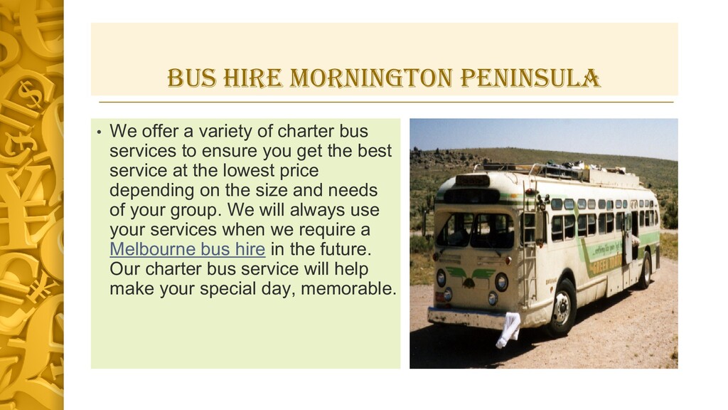 We offer a variety of charter bus services to ensure you get the best service at the lowest price depending on the size and needs of your group. We will always use your services when we require a Melbourne( https://anywheremelbourne.com.au/bus-hire-mornington )bus hire in the future. Our charter bus service will help make your special day, memorable.