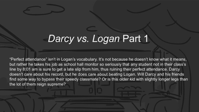 vocabulary. It’s not because he doesn’t know what it means, but rather he takes his job as school hall monitor so seriously that any student not in their class’s line by 8:01 am is sure to get a late slip from him, thus ruining their perfect attendance. Darcy doesn’t care about his record, but he does care about beating Logan. Will Darcy and his friends find some way to bypass their speedy classmate? Or is this older kid with slightly longer legs than the lot of them reign supreme?