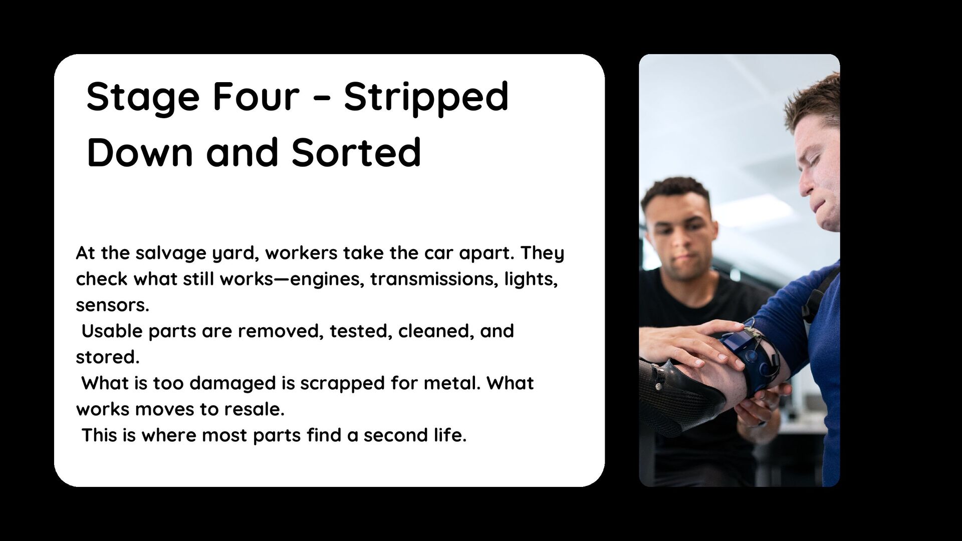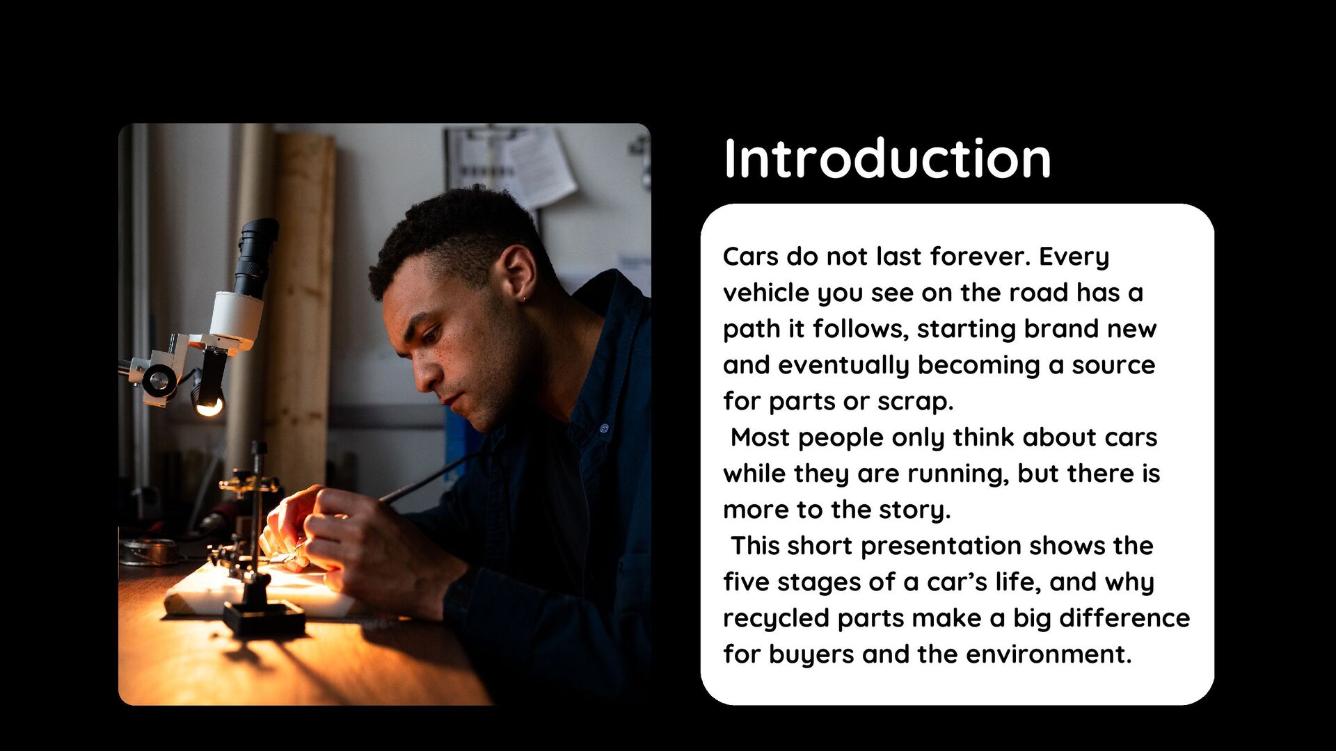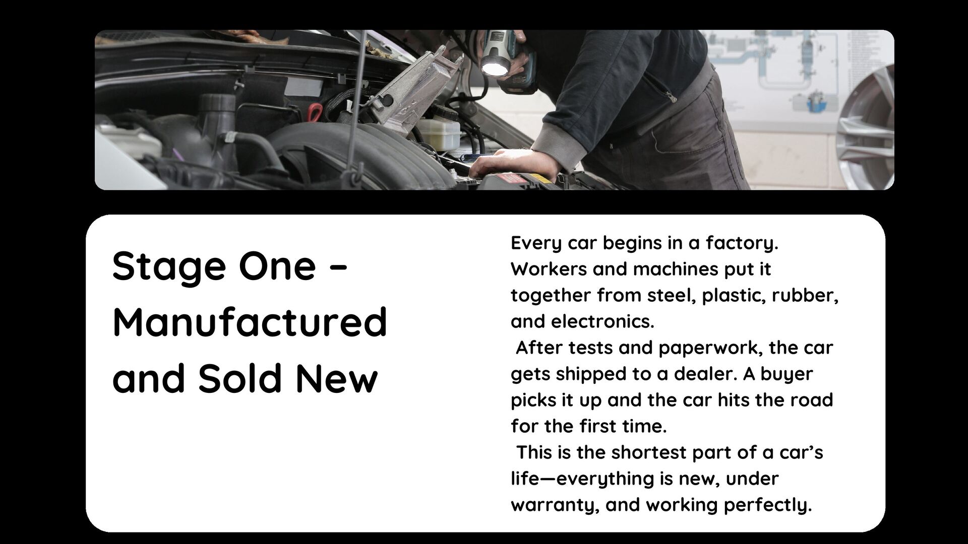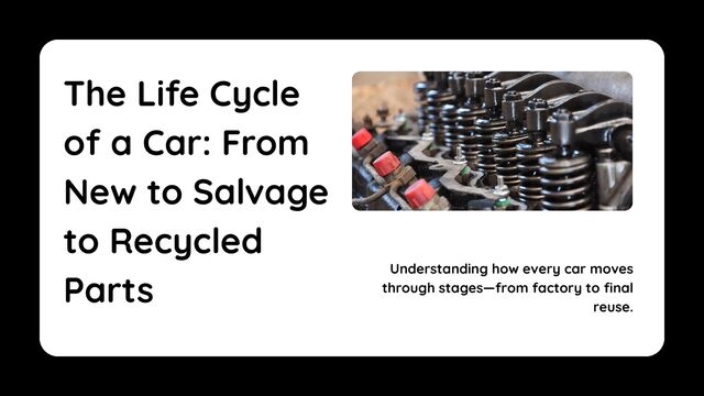 on the road has a path it follows, starting brand new and eventually becoming a source for parts or scrap. Most people only think about cars while they are running, but there is more to the story. This short presentation shows the five stages of a car’s life, and why recycled parts make a big difference for buyers and the environment.