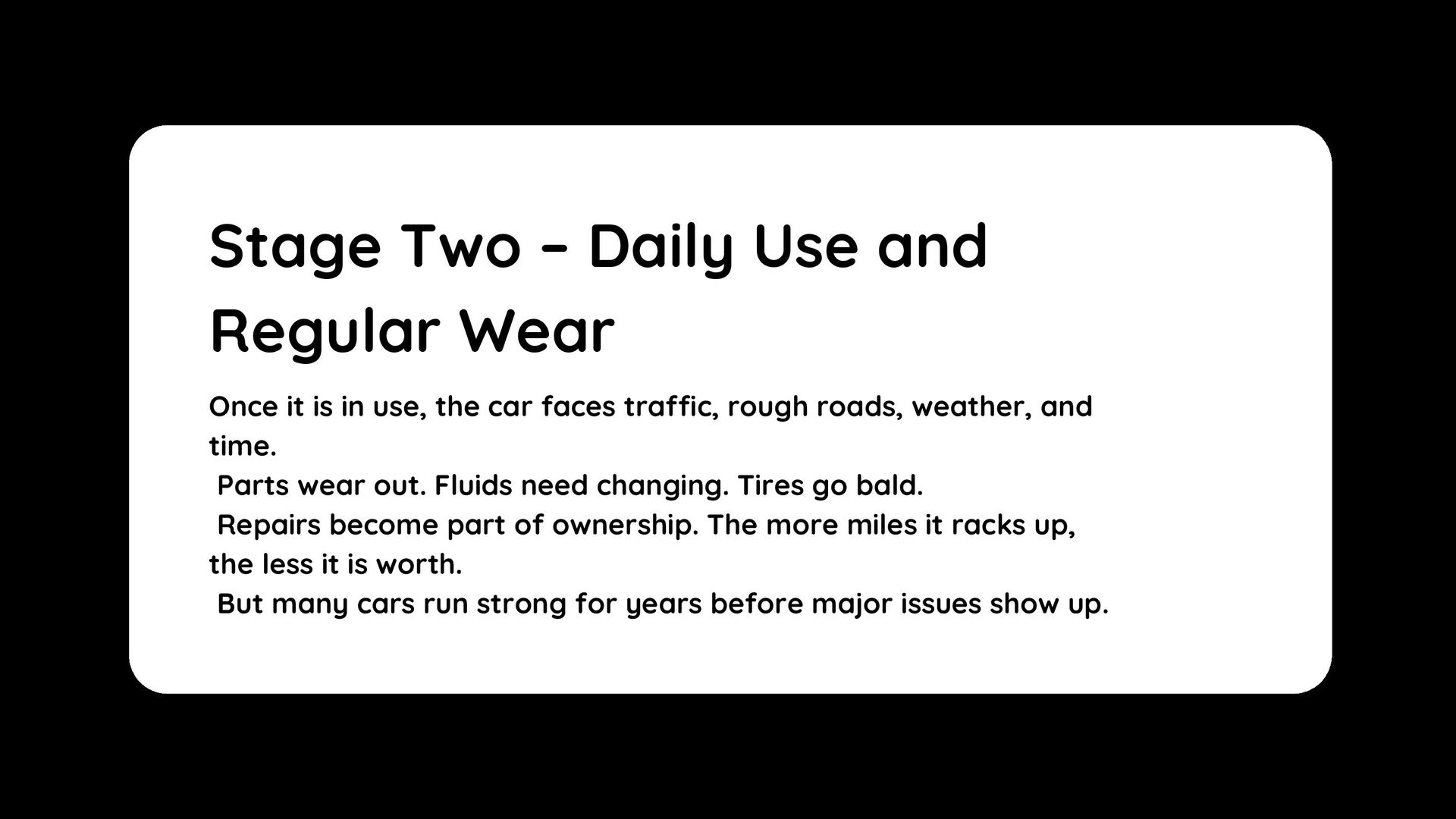 is in use, the car faces traffic, rough roads, weather, and time. Parts wear out. Fluids need changing. Tires go bald. Repairs become part of ownership. The more miles it racks up, the less it is worth. But many cars run strong for years before major issues show up.