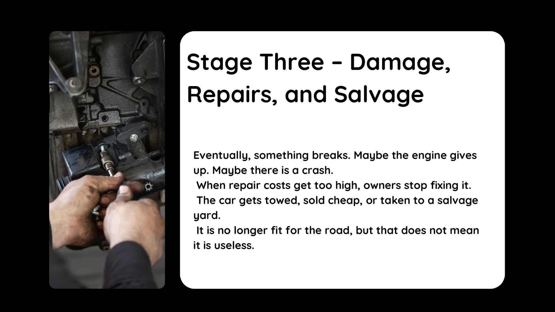 Maybe the engine gives up. Maybe there is a crash. When repair costs get too high, owners stop fixing it. The car gets towed, sold cheap, or taken to a salvage yard. It is no longer fit for the road, but that does not mean it is useless.