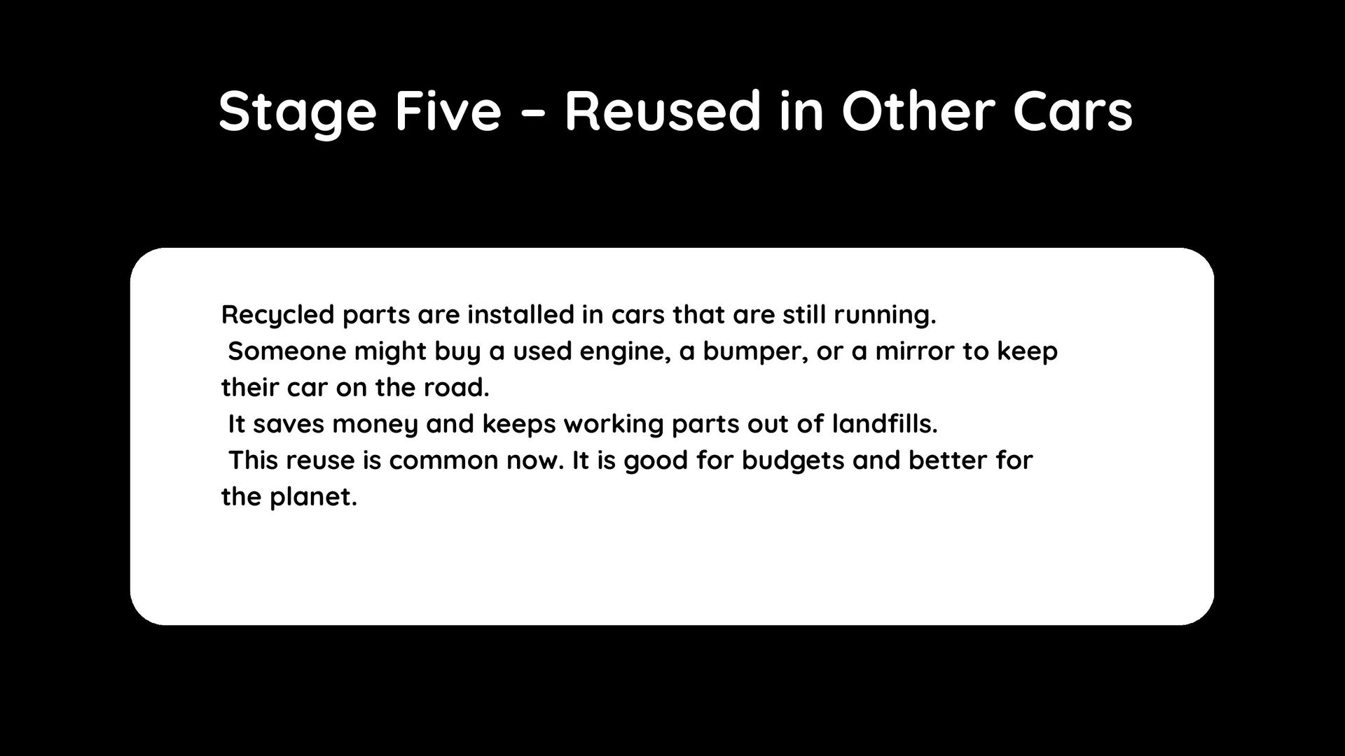 installed in cars that are still running. Someone might buy a used engine, a bumper, or a mirror to keep their car on the road. It saves money and keeps working parts out of landfills. This reuse is common now. It is good for budgets and better for the planet.