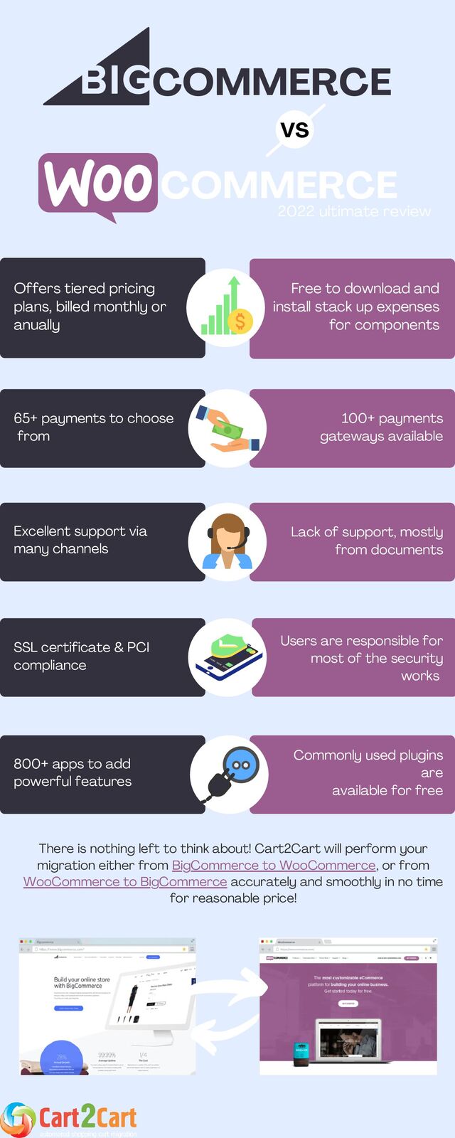 The web market is full of eCommerce solutions. They provide everything needed to build and manage an online store. Think twice before choosing the software to settle your e-store on. Making the wrong decision can harm your online business for years and cost you a fortune and time to rectify. Here you can migrate data to/from BigCommerce: https://www.shopping-cart-migration.com/bigcommerce-vs-woocommerce Or here you can migrate data to/from WooCommerce: https://www.shopping-cart-migration.com/woo