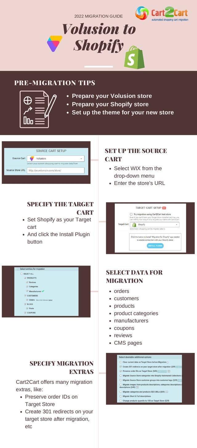 With Cart2Cart, it’s a quick and hassle-free process to migrate Volusion to Shopify. Cart2Cart automates the process while safeguarding your order IDs and SEO during the migration. Here you can start your own migration: https://www.shopping-cart-migration.com/volusion-to-shopify