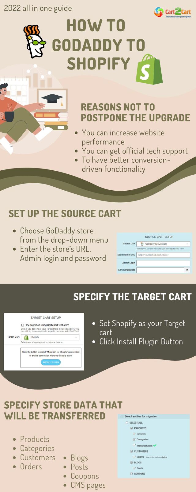 can increase website performance You can get official tech support To have better conversion- driven functionality 2022 all in one guide SET UP THE SOURCE CART Choose GoDaddy store from the drop-down menu Enter the store`s URL, Admin login and password HOW TO SPECIFY THE TARGET CART Set Shopify as your Target cart Click Install Plugin Button SPECIFY STORE DATA THAT WILL BE TRANSFERRED Products Categories Customers Orders Blogs Posts Coupons CMS pages