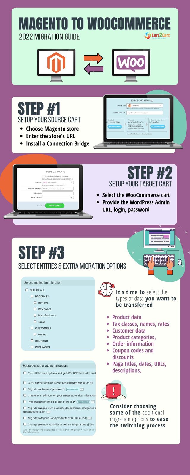 Entities & Extra Migration Options STEP STEP STEP #1 #1 #1 Setup Your Source Cart MAGENTO TO WOOCOMMERCE MAGENTO TO WOOCOMMERCE MAGENTO TO WOOCOMMERCE STEP STEP STEP #2 #2 #2 Setup Your Target Cart Choose Magento store Enter the store's URL Install a Connection Bridge Select the WooCommerce cart Provide the WordPress Admin URL, login, password It's time to select the types of data you want to be transferred Consider choosing some of the additional migration options to ease the switching process Product data Tax classes, names, rates Customer data Product categories, Order information Coupon codes and discounts Page titles, dates, URLs, descriptions,