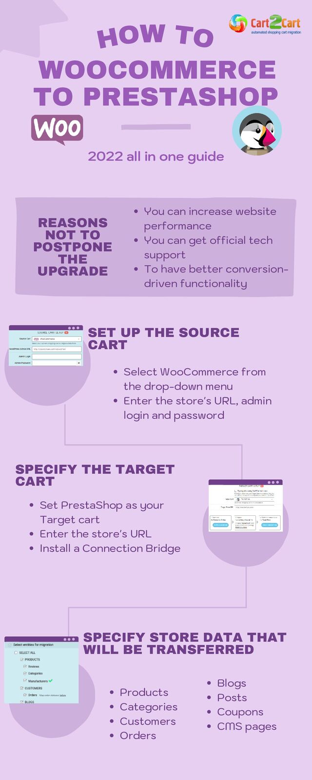 the drop-down menu Enter the store's URL, admin login and password WOOCOMMERCE 2022 all in one guide You can increase website performance You can get official tech support To have better conversion- driven functionality REASONS NOT TO POSTPONE THE UPGRADE HOW TO SPECIFY THE TARGET CART Set PrestaShop as your Target cart Enter the store's URL Install a Connection Bridge SPECIFY STORE DATA THAT WILL BE TRANSFERRED Products Categories Customers Orders Blogs Posts Coupons CMS pages