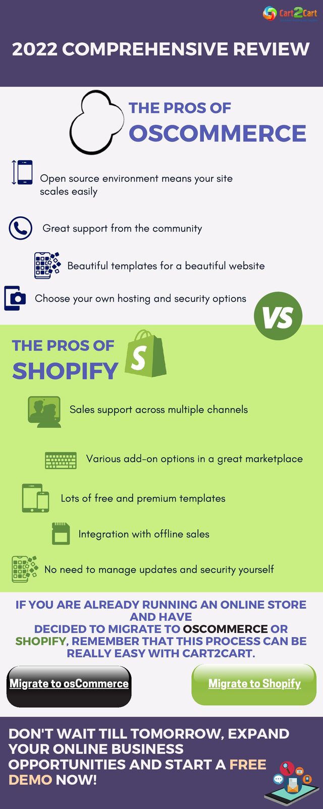 The most efficient way to find the right-your-size eCommerce solution is simply to match the key features and functions of platforms and then come up with the decision. The infographic aims to compare osCommerce vs Shopify - two popular user-friendly hosted shopping carts and uncover their “good” and “bad” sides. Here you can migrate data to/from osCommerce: https://www.shopping-cart-migration.com/oscommerce-vs-shopify Or here you can migrate data to/from Shopify: https://www.shopping-cart-migra