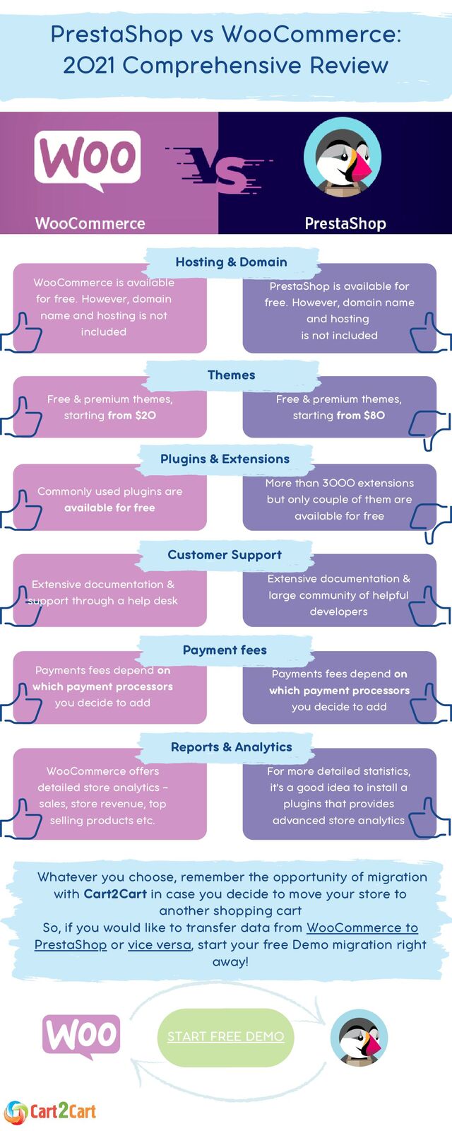 Looking for the ultimate e-solution for running an online business but still, have doubts? Assess the utmost severity of PrestaShop vs WooCommerce judgment. The core difference between PrestaShop vs WooCommerce is that WooCommerce is a WordPress plugin, while PrestaShop is an independent eCommerce platform. Both solutions have their pros and cons. Here you can migrate data to/from WooCommerce: https://www.shopping-cart-migration.com/woocommerce-vs-prestashop Or here you can migrate data to/from