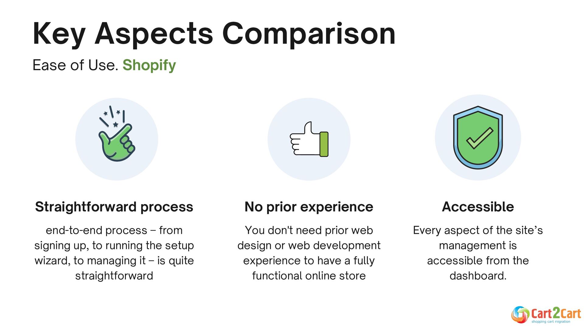 the setup wizard, to managing it – is quite straightforward No prior experience You don't need prior web design or web development experience to have a fully functional online store Accessible Every aspect of the site’s management is accessible from the dashboard. Key Aspects Comparison Ease of Use. Shopify