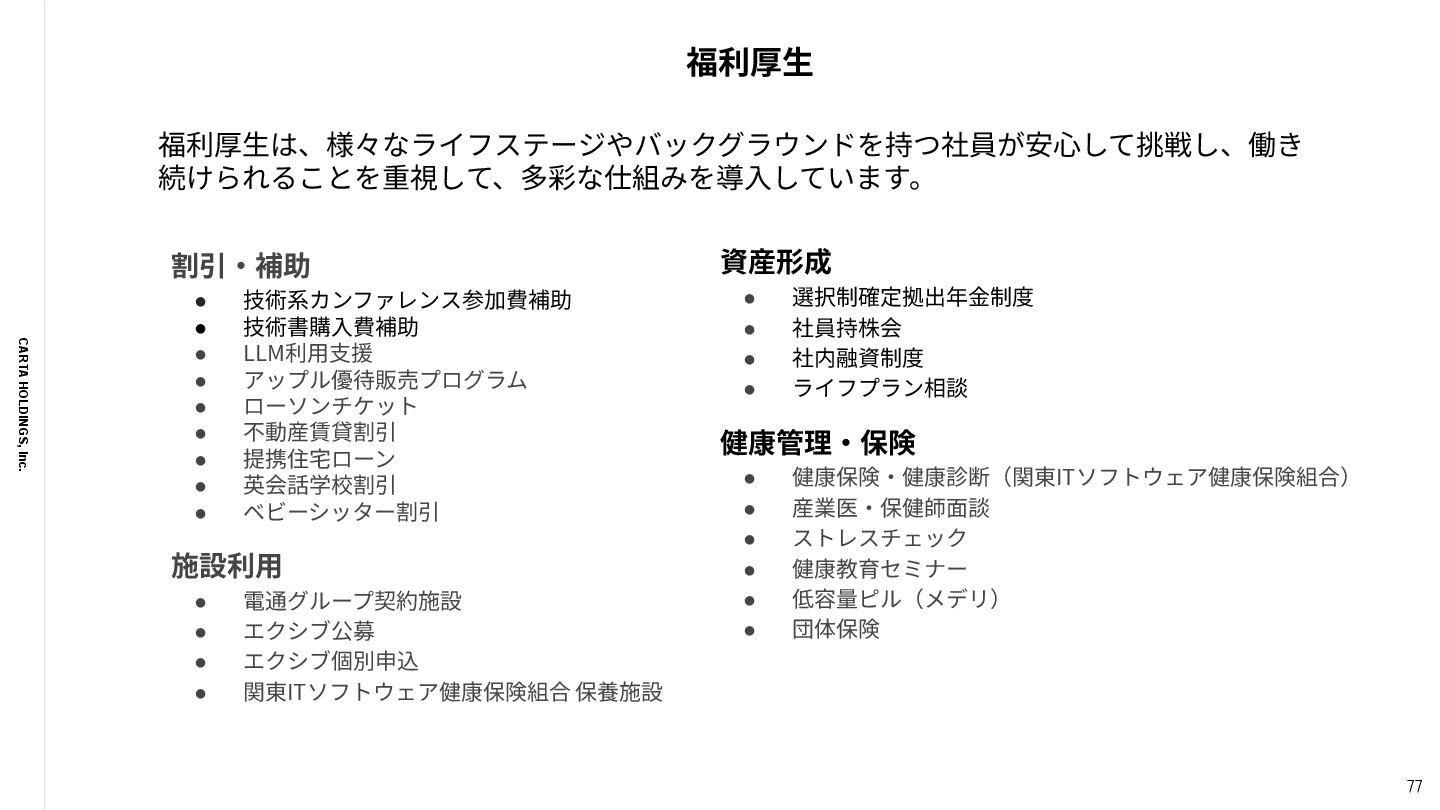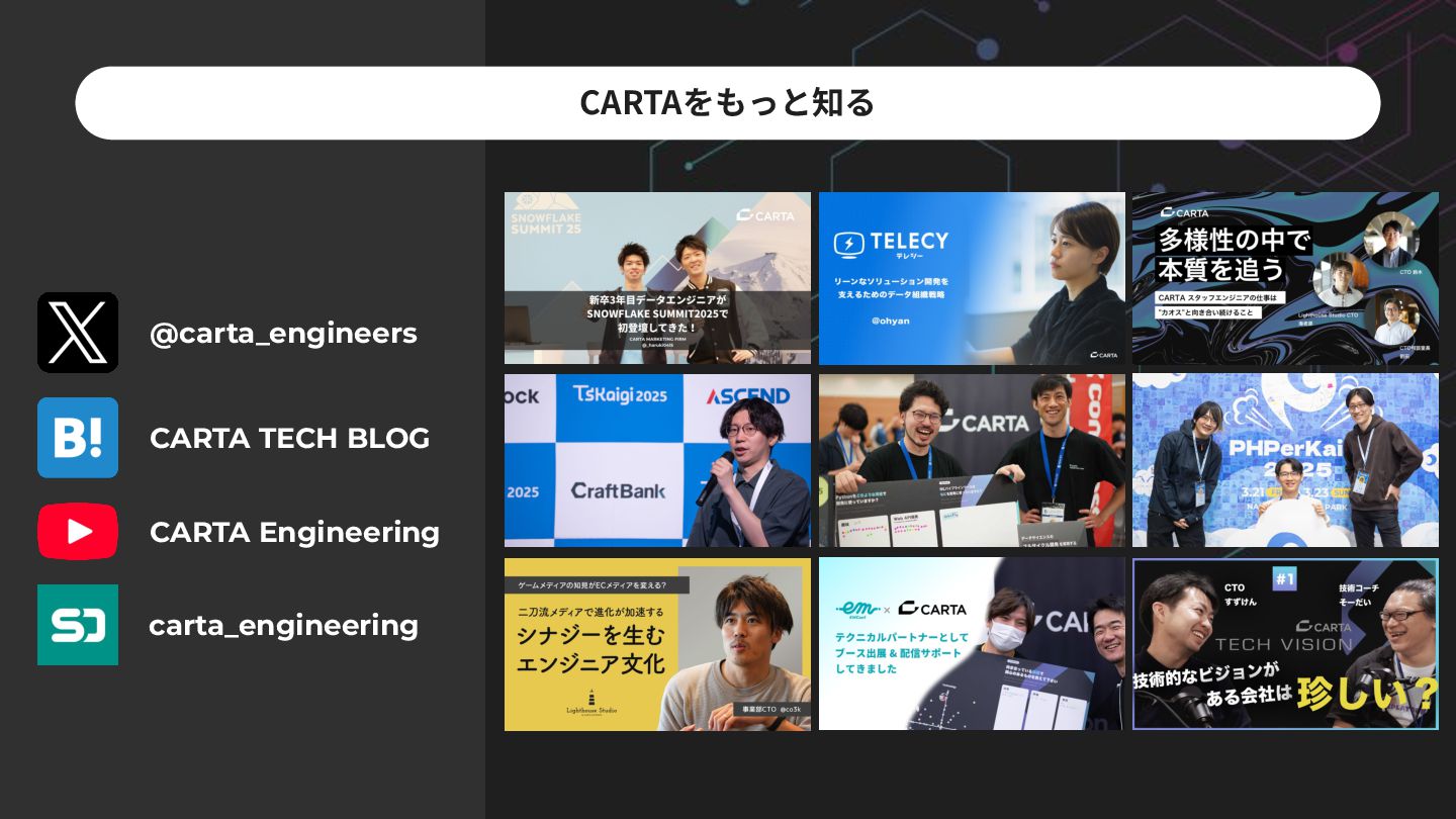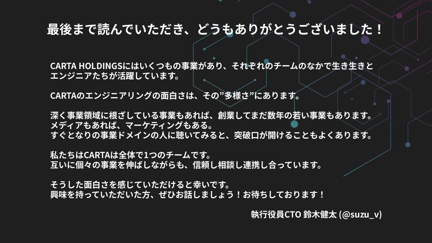 MaterialDesign, StoryBook, Next.js, Nuxt.js Backend Scala, Go, Rust, PHP, Python, Elixir, Node.js, Erlang, Kotlin, make, Perl, Ruby, Java Infrastructure GCP, AWS, nginx, Elasticsearch, Fluentd, Memcached, Redis, NewRelic, DataDog, Grafana, Terraform, Firebase, Splunk CI/CD CircleCI, TravisCI, GitHub Actions, Jenkins, make, AWS Code Series, Google Cloud Build iOS/Android Swift, Objective-C, Objective-C++, Kotlin, Unity, fastlane 多様な技術から、事業‧サービス‧チームの特性を考慮して最適な技術を選びます Data Engineering Snowflake, dbt, SELECT.dev, Elementary Cloud, Fivetran, SQL, trocco, BigQuery, Redshift