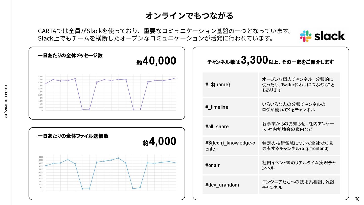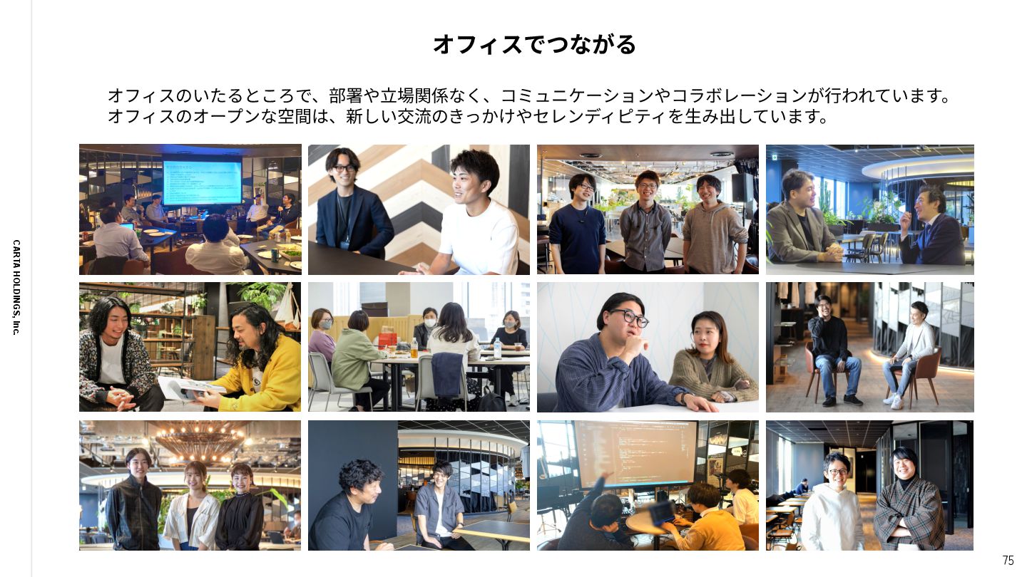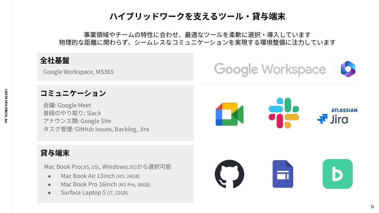 MaterialDesign, StoryBook, Next.js, Nuxt.js Backend Scala, Go, Rust, PHP, Python, Elixir, Node.js, Erlang, Kotlin, make, Perl, Ruby, Java Infrastructure GCP, AWS, nginx, Elasticsearch, Fluentd, Memcached, Redis, NewRelic, DataDog, Grafana, Terraform, Firebase, Splunk CI/CD CircleCI, TravisCI, GitHub Actions, Jenkins, make, AWS Code Series, Google Cloud Build iOS/Android Swift, Objective-C, Objective-C++, Kotlin, Unity, fastlane 多様な技術から、事業‧サービス‧チームの特性を考慮して最適な技術を選びます Data Engineering Snowflake, dbt, SELECT.dev, Elementary Cloud, Fivetran, SQL, trocco, BigQuery, Redshift