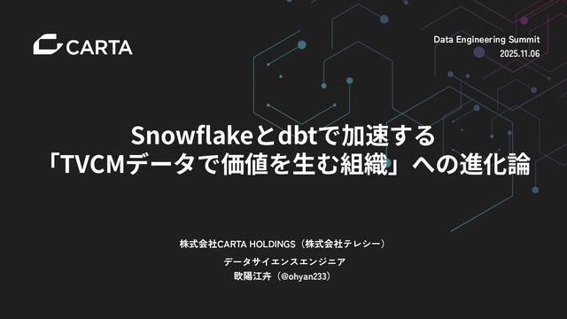 本セッションは、運用型テレビCMを主軸とするテクノロジードリブンなマーケティングパートナーとして、創業当初から「データで価値を生む組織」を目指し、進化させてきたデータ基盤について紹介します。多様なマーケティングデータや消費者行動データを扱う中で、Snowflakeとdbt Cloudを活用し、柔軟かつ安定した運用を実現。さらに年間1,000万円以上のコスト削減につながった改善事例、事業のスケーラビリティを支える設計・実装、開発組織の半数がデータサイエンスエンジニアである理由についてお話しします。