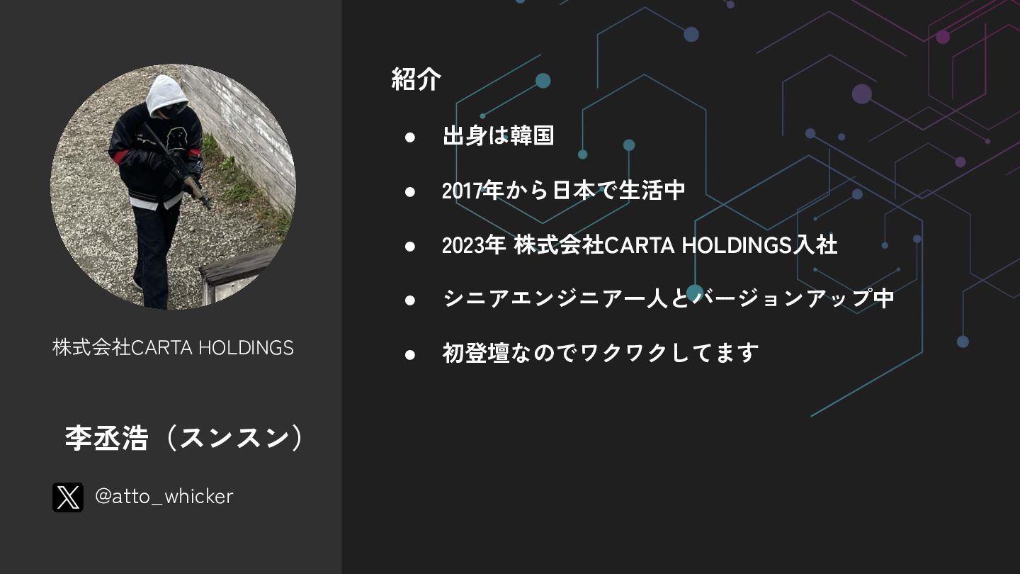株式会社CARTA HOLDINGS 李丞浩(スンスン) @atto_whicker 紹介 • 出身は韓国 • 2017年から日本で生活中 •