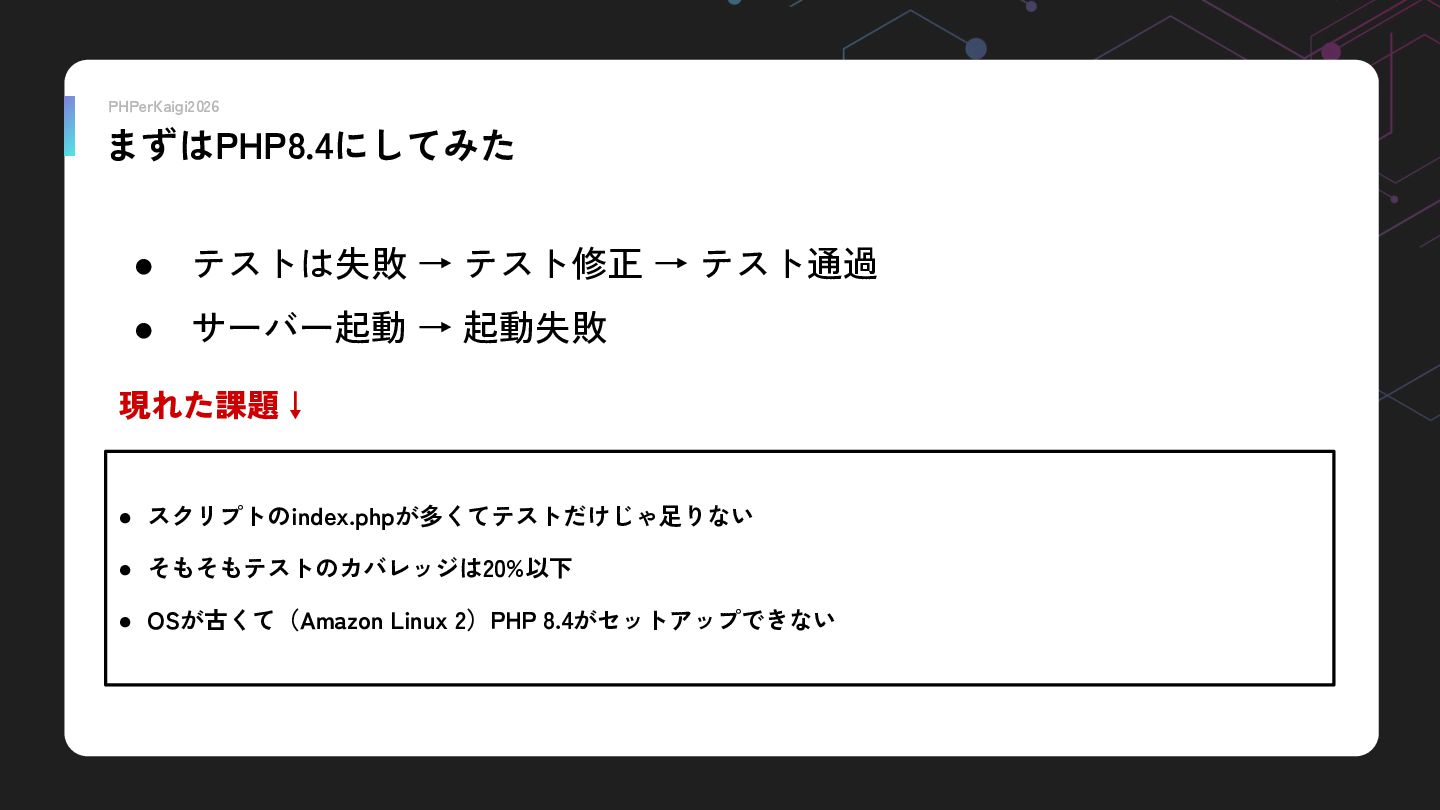 PHPerKaigi2026 まずはPHP8.4にしてみた • スクリプトのindex.phpが多くてテストだけじゃ足りない • そもそもテストのカバレッジは20%以下 • OSが古くて(Amazon Linux 2)PHP