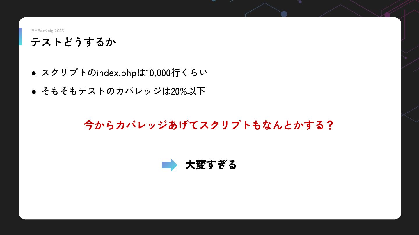 PHPerKaigi2026 テストどうするか • スクリプトのindex.phpは10,000行くらい • そもそもテストのカバレッジは20%以下 今からカバレッジあげてスクリプトもなんとかする? 大変すぎる