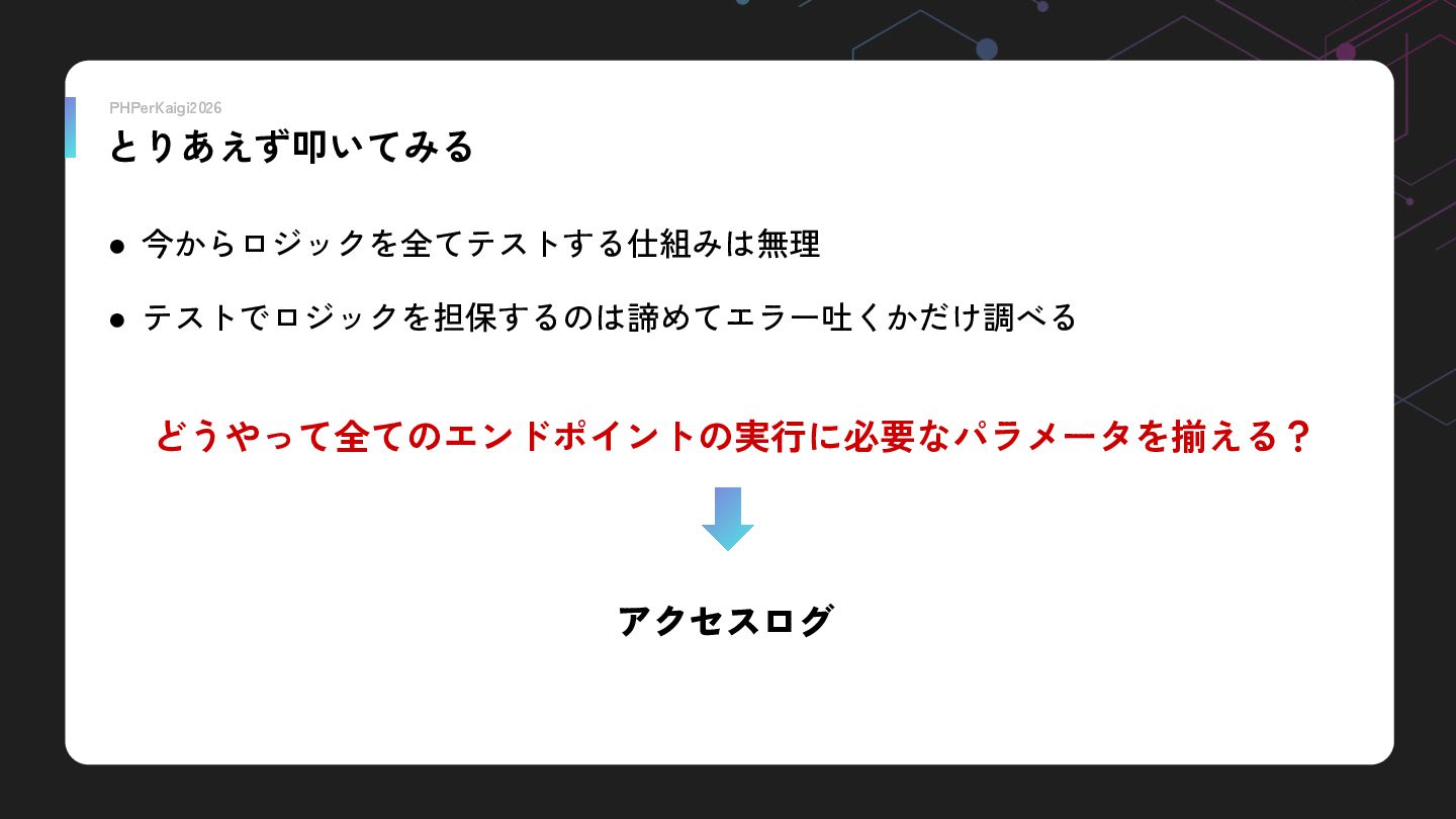 PHPerKaigi2026 とりあえず叩いてみる • 今からロジックを全てテストする仕組みは無理 • テストでロジックを担保するのは諦めてエラー吐くかだけ調べる どうやって全てのエンドポイントの実行に必要なパラメータを揃える? アクセスログ