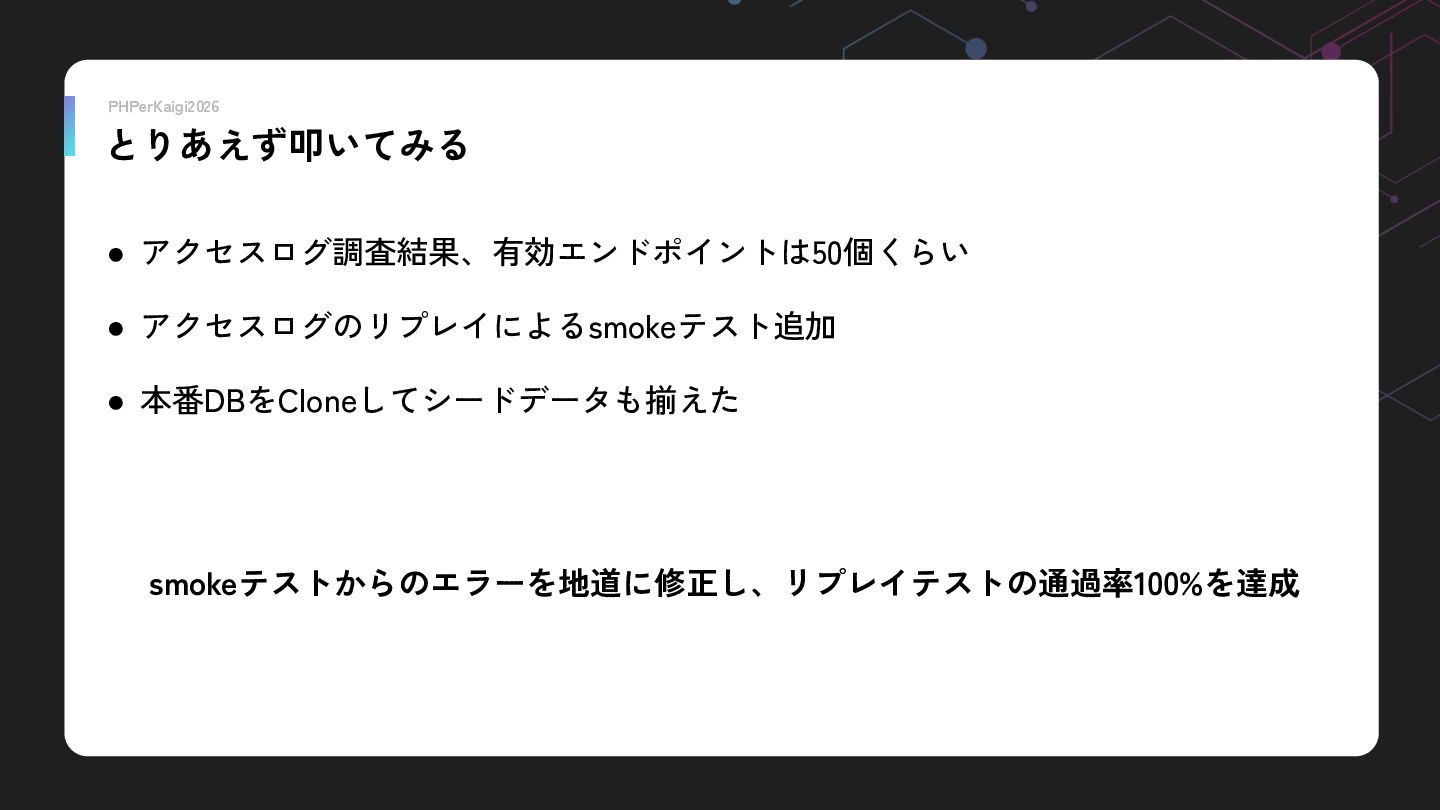 PHPerKaigi2026 とりあえず叩いてみる • アクセスログ調査結果、有効エンドポイントは50個くらい • アクセスログのリプレイによるsmokeテスト追加 • 本番DBをCloneしてシードデータも揃えた smokeテストからのエラーを地道に修正し、リプレイテストの通過率100%を達成