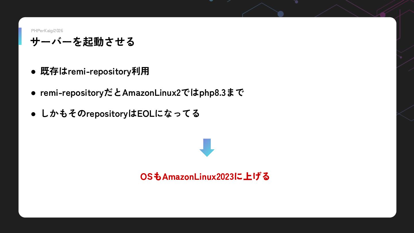 PHPerKaigi2026 サーバーを起動させる • 既存はremi-repository利用 • remi-repositoryだとAmazonLinux2ではphp8.3まで • しかもそのrepositoryはEOLになってる OSもAmazonLinux2023に上げる