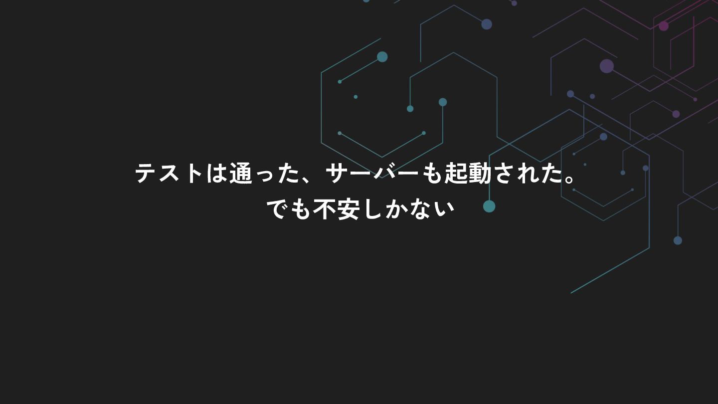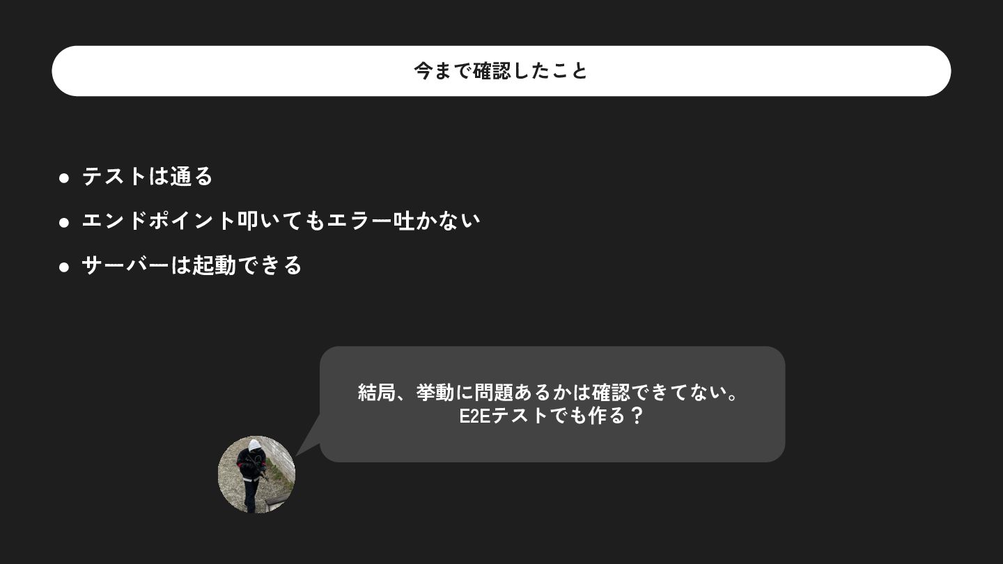 今まで確認したこと • テストは通る • エンドポイント叩いてもエラー吐かない • サーバーは起動できる 結局、挙動に問題あるかは確認できてない。 E2Eテストでも作る?