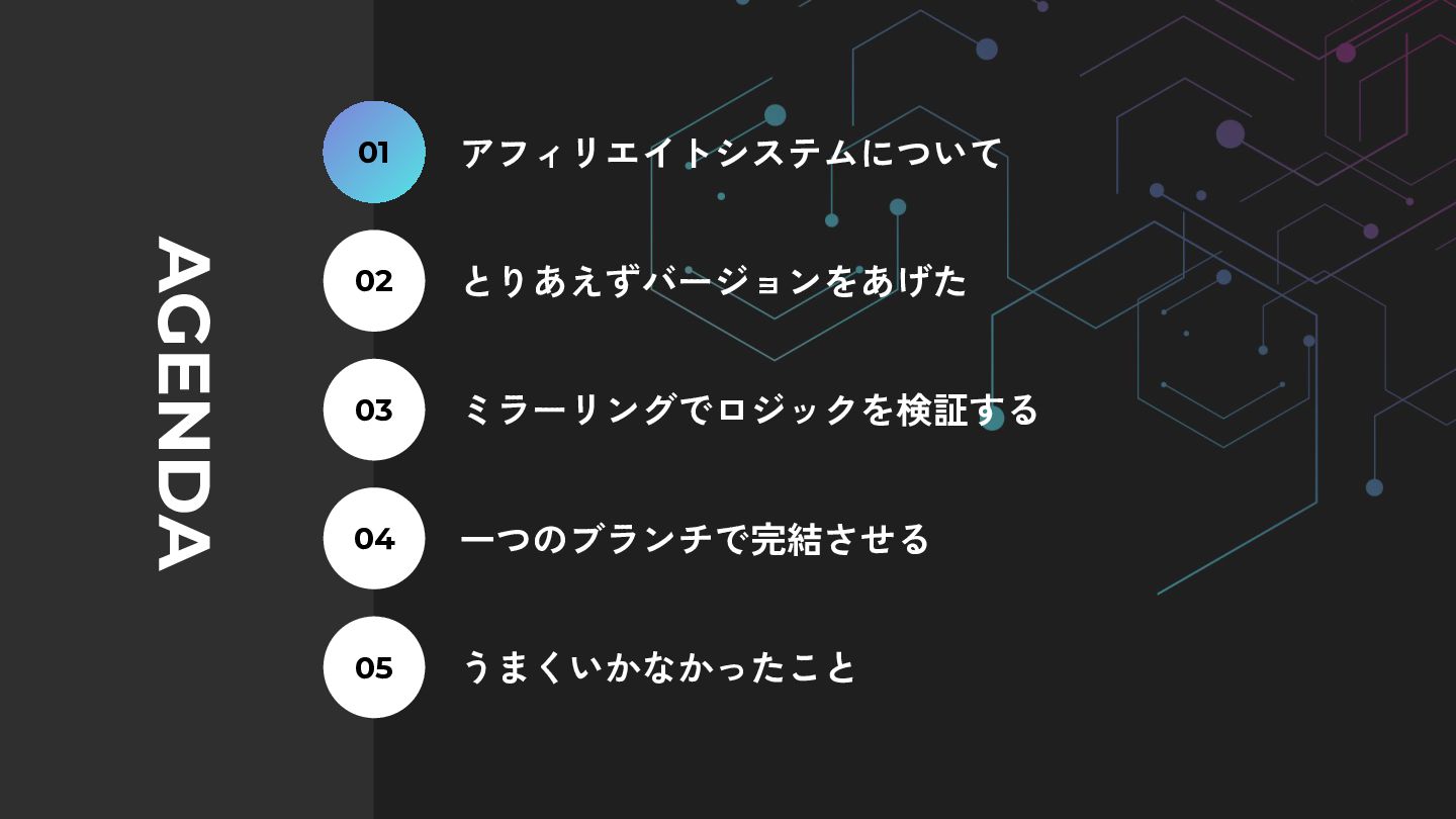 AGENDA 01 アフィリエイトシステムについて 02 とりあえずバージョンをあげた 03 ミラーリングでロジックを検証する 04 一つのブランチで完結させる 05