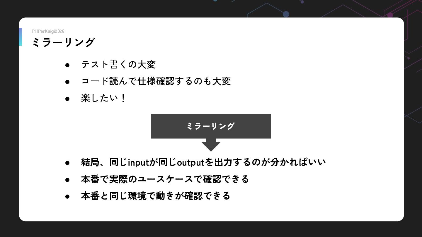 PHPerKaigi2026 ミラーリング • テスト書くの大変 • コード読んで仕様確認するのも大変 • 楽したい! • 結局、同じinputが同じoutputを出力するのが分かればいい
