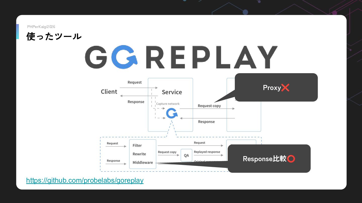 PHPerKaigi2026 使ったツール https://github.com/probelabs/goreplay Proxy❌ Response比較⭕