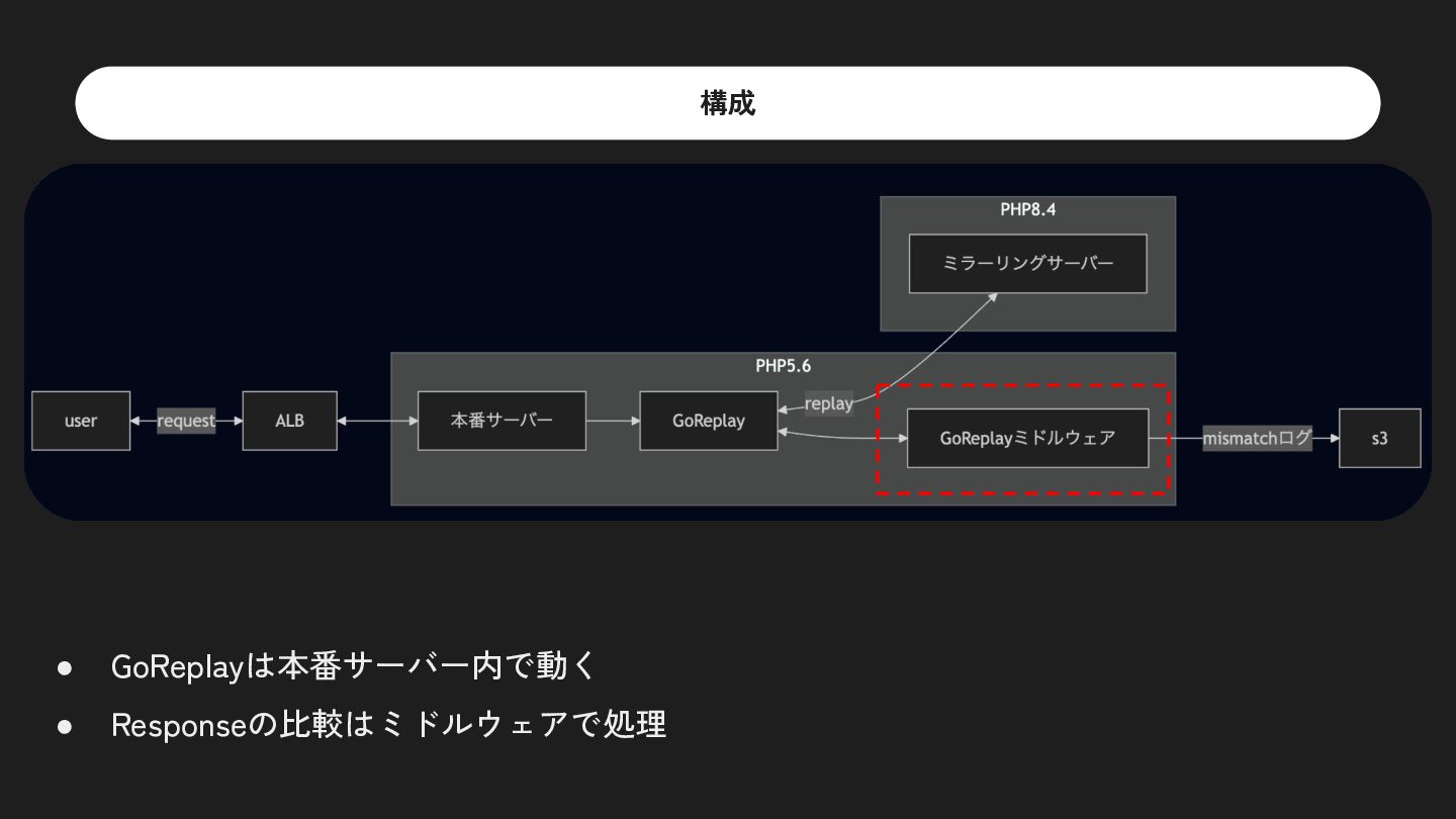 構成 • GoReplayは本番サーバー内で動く • Responseの比較はミドルウェアで処理