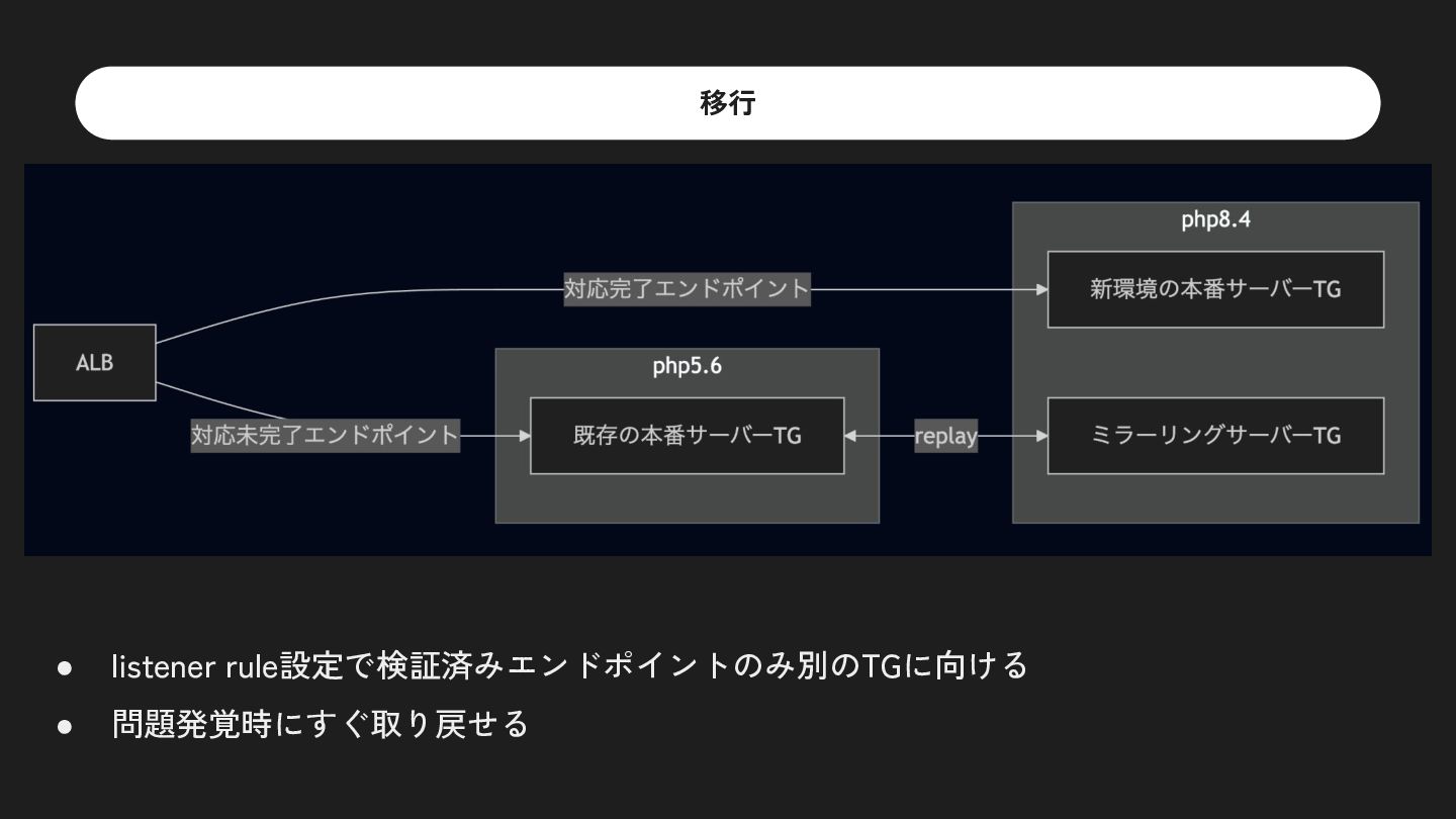 移行 • listener rule設定で検証済みエンドポイントのみ別のTGに向ける • 問題発覚時にすぐ取り戻せる