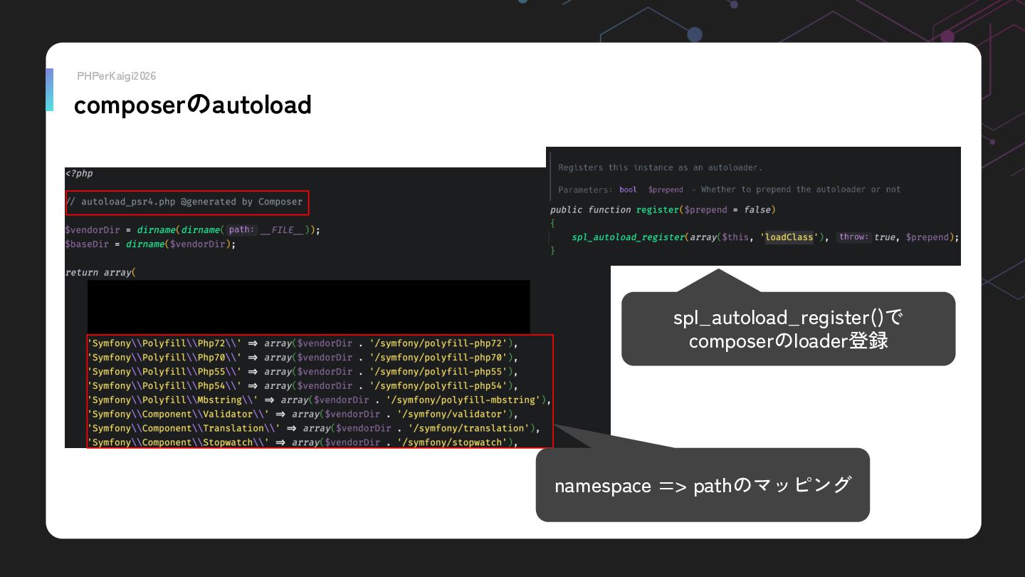 PHPerKaigi2026 composerのautoload namespace => pathのマッピング spl_autoload_register()で composerのloader登録