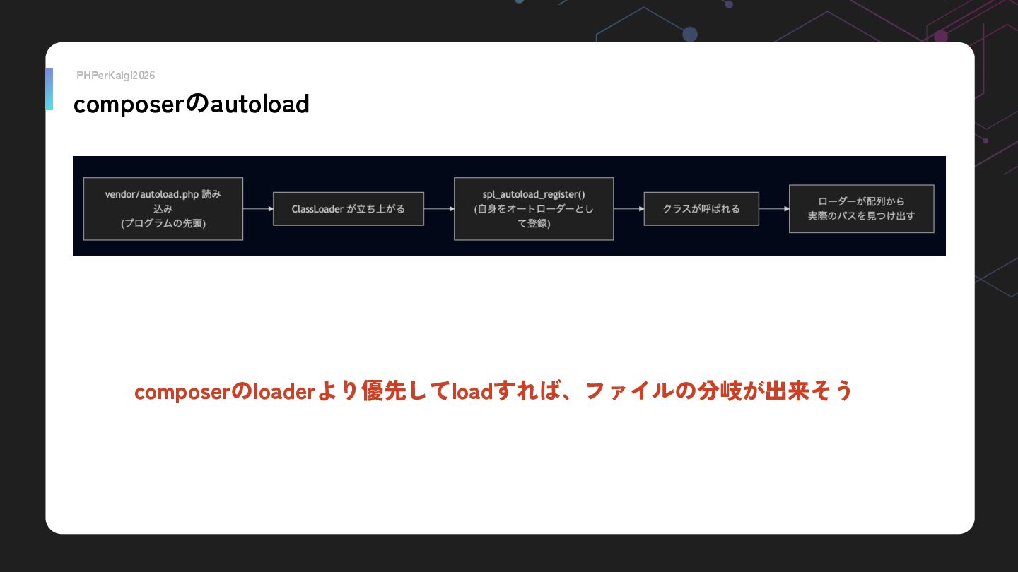 PHPerKaigi2026 composerのautoload composerのloaderより優先してloadすれば、ファイルの分岐が出来そう